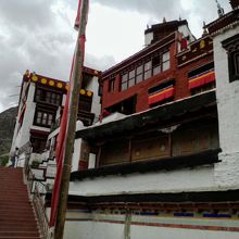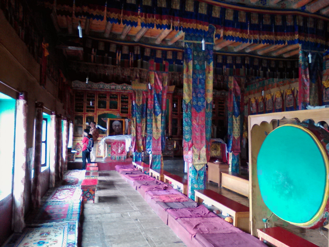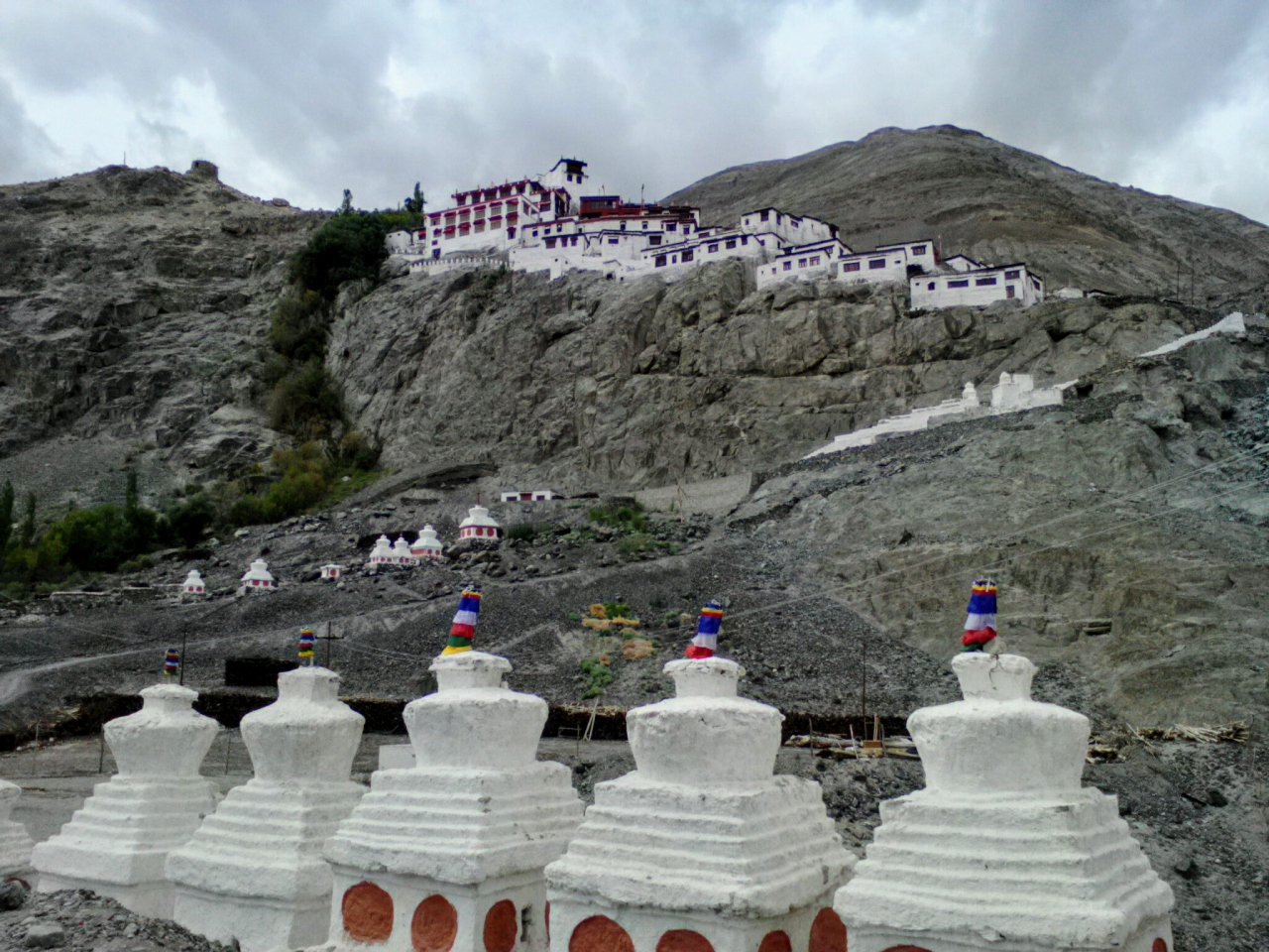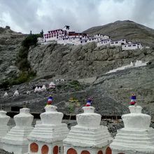 デスキットでのバスの乗り換え時間の間に行ってみました。バススタンドから見るとかなり山でしたが徒歩でチャレンジ。1kmちょっと歩くと登り口である門が現れます。くねくねとした自動車道続いていますが、ちゃんとショートカットできる小道もあります。どちらが楽かは別にしてもちろん小道をチョイス。白い仏塔が並ぶ脇を歩き自動車道に戻るとその先にチケット売り場(30Rs)があります。最後の急な坂を登ればゴンパに到着です。