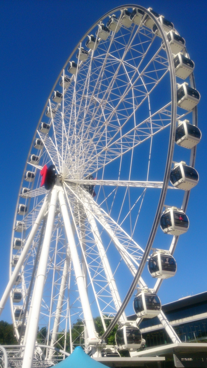 ダウンタウンからクイーンストリートモールを抜け、ブリスベンリバーを渡ると、左手にサウスバンクパークランズブリスベンが川に沿って広がります。催し物が開催できる大きな広場では、アジアをテーマにした催し物が行われていていました。多くの人たちがパークののんびりとした雰囲気を楽しんでいます。バークを進んでいくと象徴のような観覧車も設置されていて、散歩を楽しめますよ。