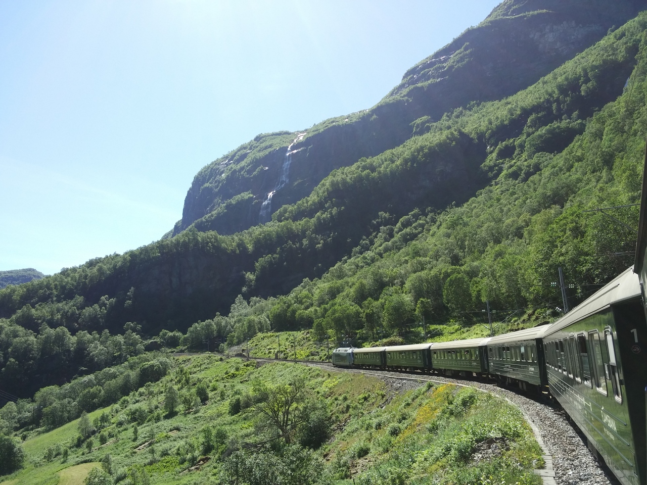 夏の間は、豪快な滝と迫力ある清流を眺めながら急な斜面をゆっくり登ります。車もアクセスできないまさに秘境!途中、線路のすぐそばを流れる滝に10分ほど停車。音楽が流れる中、妖精の姿をした女性の舞が見られます。神秘的な演出にしばし時を忘れます。終着駅ミュールダールはベンゲル鉄道に繋がっています。今回は往復フロム鉄道に乗り風景を堪能しました