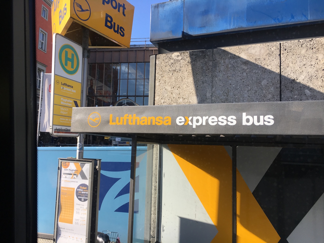 ターミナル1に到着したのですが、バス乗り場がわからず探し回りました。結局Sバーン近くのバスターミナルから乗車。インフォメーションの人に1番のバス停だと聞いたのでそこで待っていると、バスは2番近くに停まりました。バスそのものは前に中央駅と(ドイツ語ですが)書いてあるし、車体にルフトハンザのマークも入っているのでわかりやすいです。ミュンヘン中央駅間は往復とも45分ほどでした。