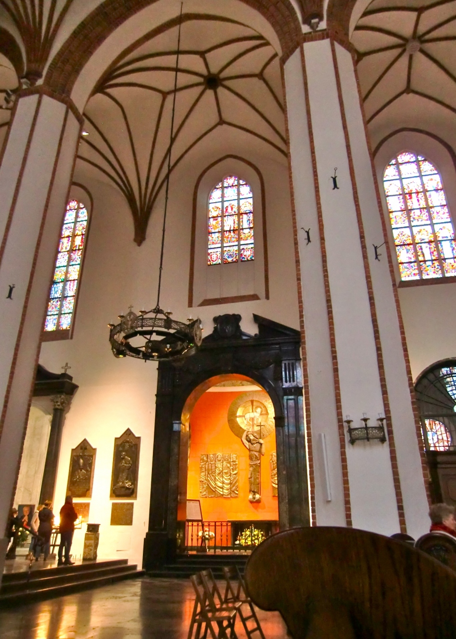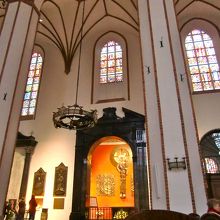 内部はゴシック様式の落ち着いた内装。特に白にレンガ色の装飾がシンプルできれいでした。ステンドグラスもよく映えるデザインだと思います。また、シャンデリアが歴史を感じさせる古い雰囲気で素敵でした。
