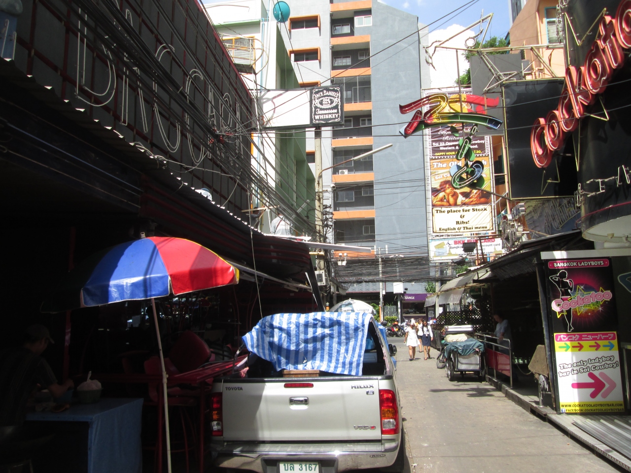 アルコール禁止日以外は年中無休、深夜2時から3時頃まで営業しているため、日中が唯一のメンテナンスの機会です。ソイカウボーイに並んでいる各バーには工事用の車両が横付けされて、お店の看板、音響設備、照明などの修理を行っていました。