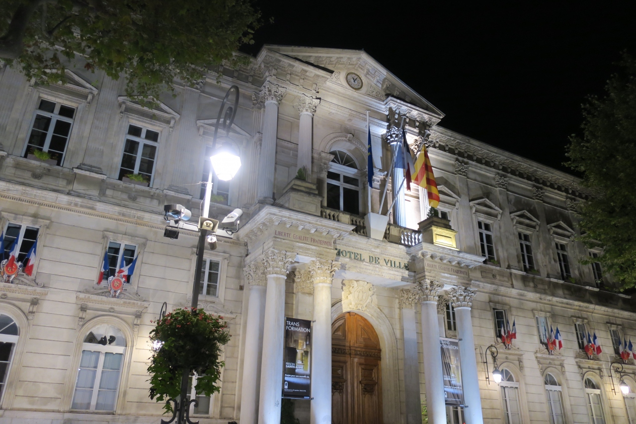 法王庁の近く、ロルロージュ広場に面して建っています。隣にはオペラ座があり、二つとも正面の装飾が素晴らしく、歴史を感じさせる雰囲気のある建物です。夜になるとライトアップされ、昼間とはまた違った趣を楽しむことができます。