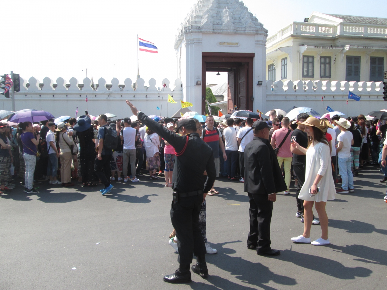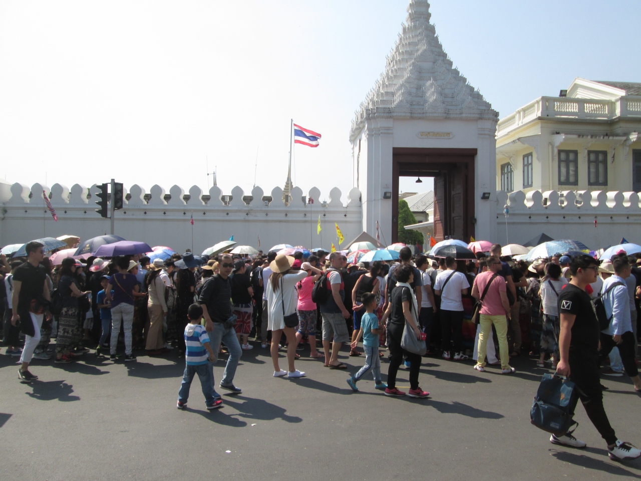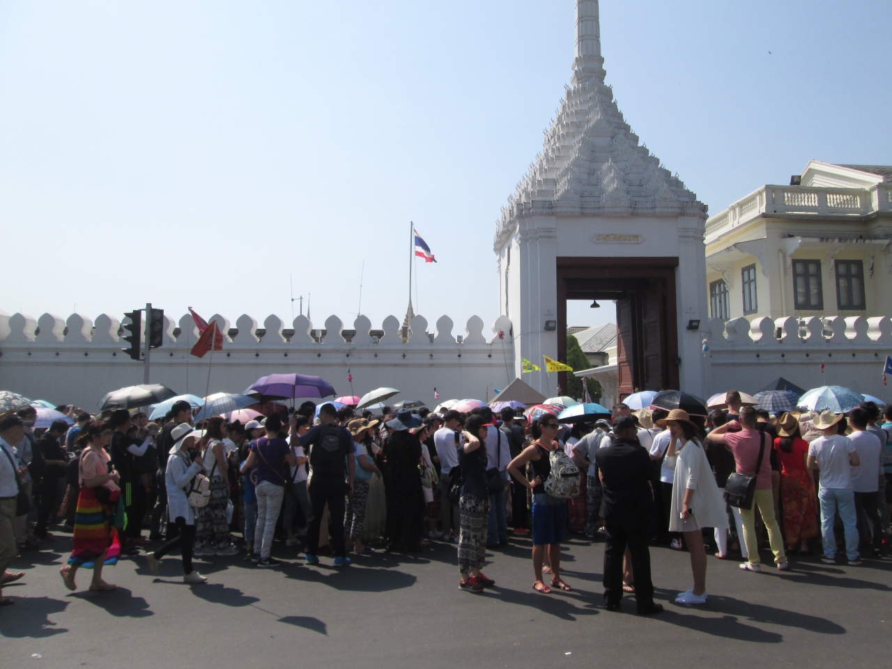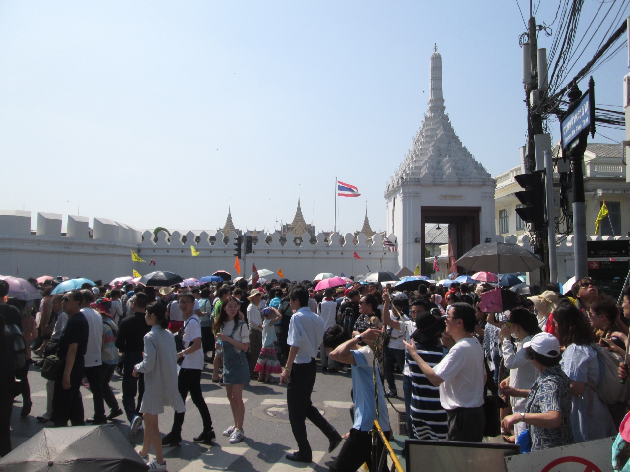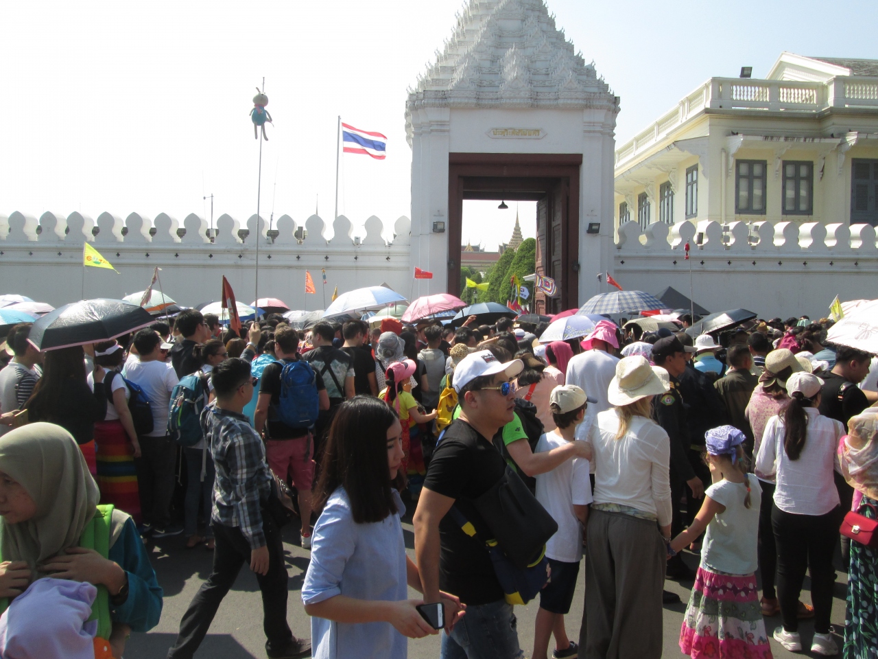 旧正月のシーズンに王宮に訪問しました。2016年10月、プミポン国王がご逝去されてから最初の旧正月ということもあり、例年よりも中国系の団体客が多く、さらに、一般弔問や葬儀イベントでたくさんのタイ人が訪問してきていることもあり、王宮入口のウィセートチャイスイー門前は人がごった返していました。
