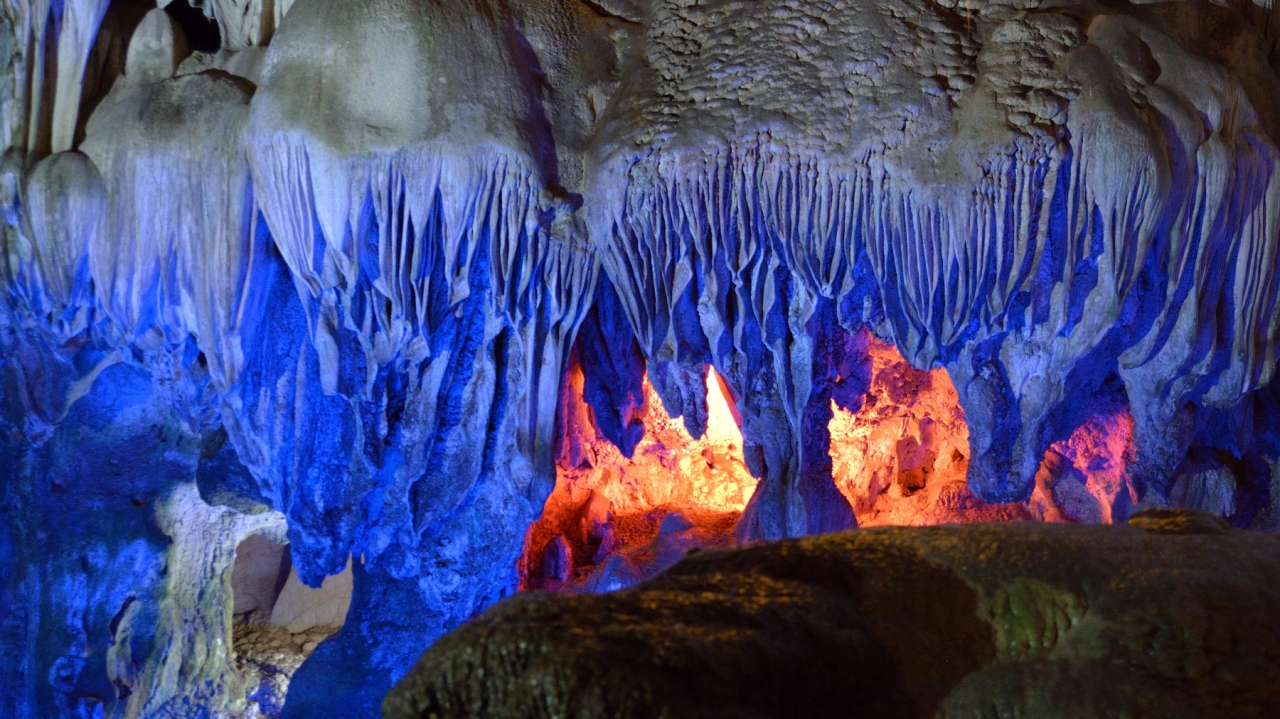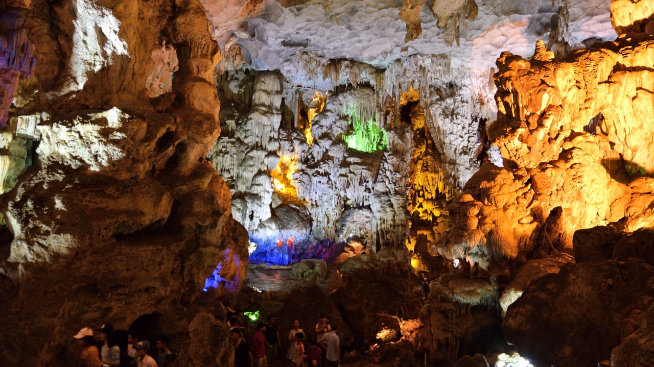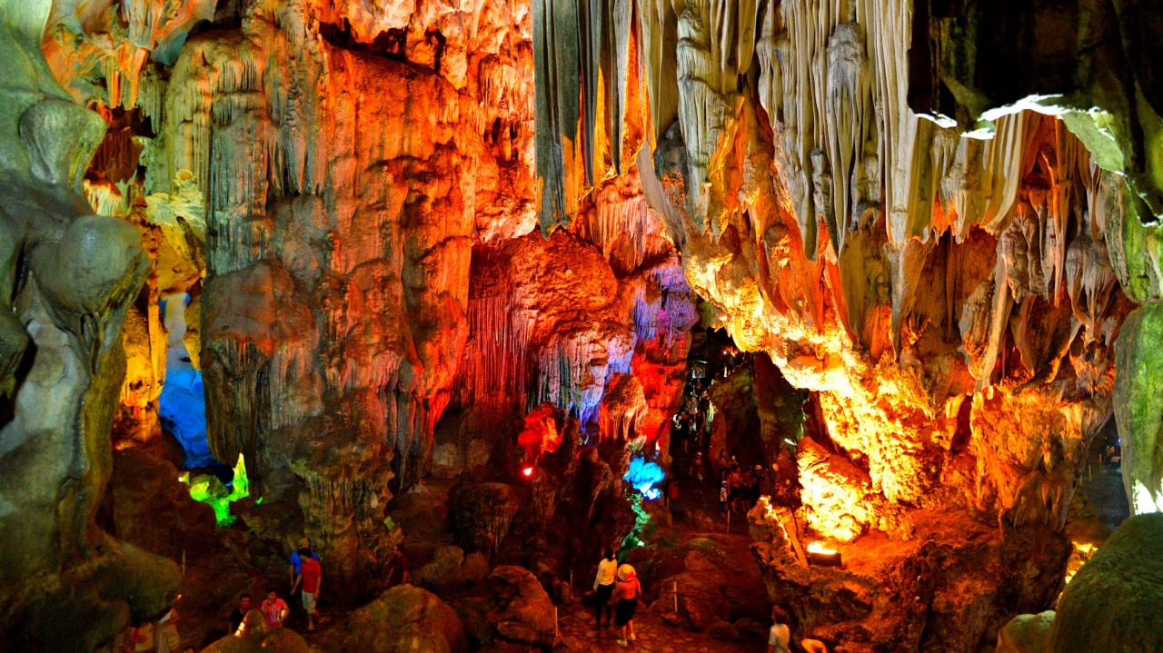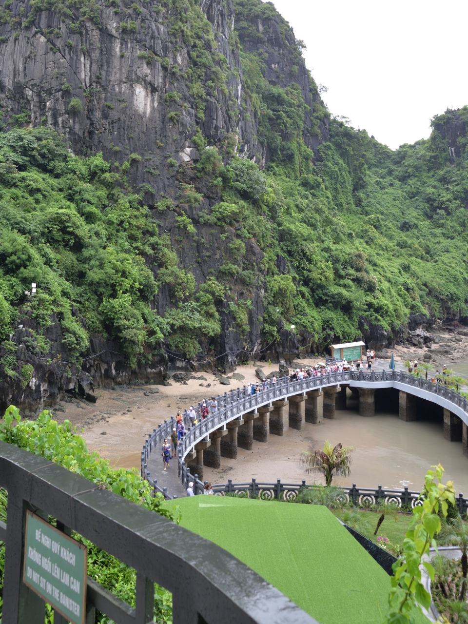 洞窟入り口側の船着き場で船を降りて少し平坦な道を歩きその後、洞窟まで階段を昇って行きます。洞窟の入口は狭いですが中は広くてライトアップされて明るいです、でも写真を撮るには暗いです。綺麗にライトアップされた鍾乳洞も面白いです。中は階段を上がったり降りたりですが、それほど大変ではないです。時々上からしずくが落ちてきて服が濡れるので注意してください。出口側からでて、乗船場まで階段を降りて行くと、乗ってきた観光船が、出口側乗船場へ来て待ってくれています。降りる前に自分の船を覚えておいた方が良いですよ。