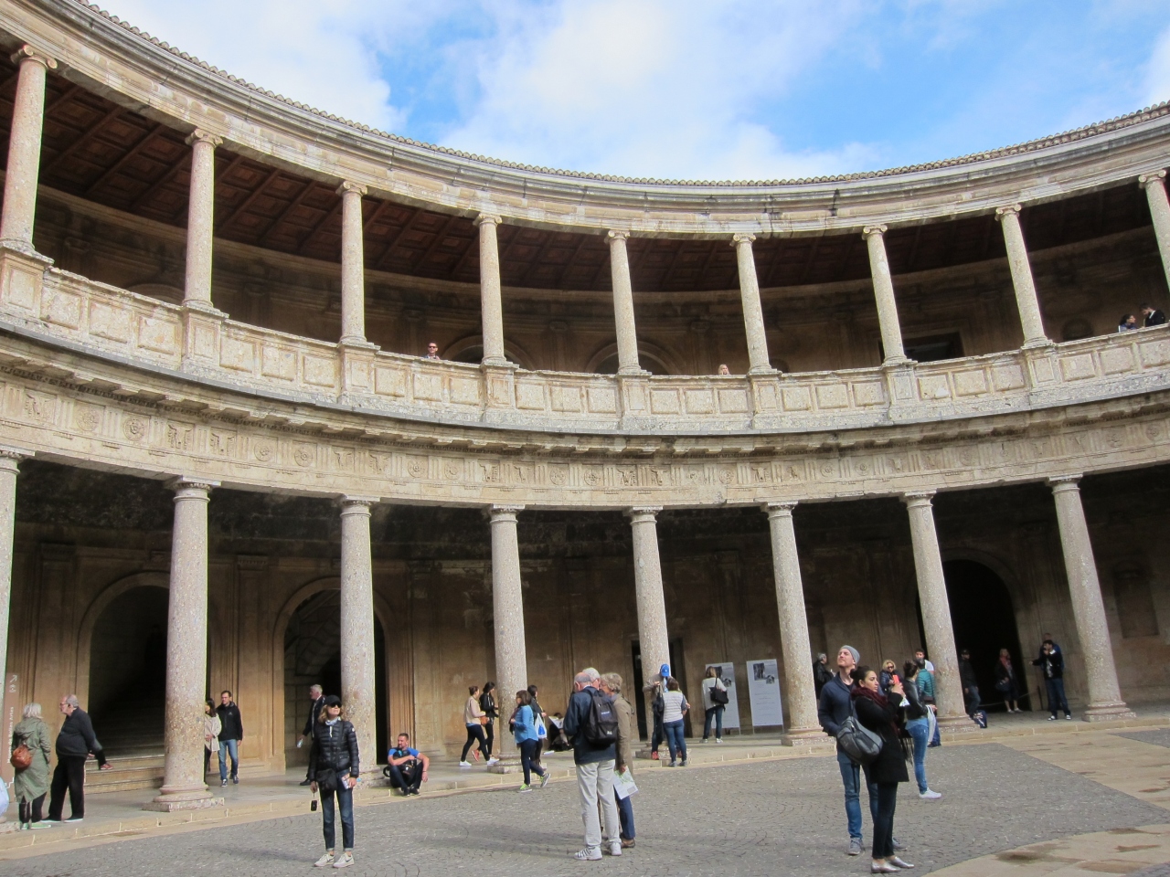アルハンブラ宮殿を無血開場させたカルロス1世によって作られた宮殿。16世紀のルネサンス様式で、四角い建物の中に円形の中庭を配している。入って左側におみやげ物屋さんがあり、なかなかセンスの良い物があるので、必見。