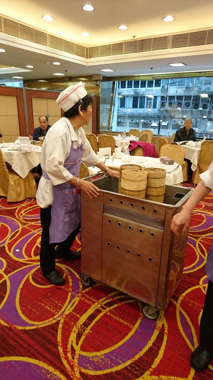 できるだけ朝早い時間に行かないと席がなくなります。というのも、常連のお客さんのために席が予約済みとなっており、10時くらいにはのんびり朝飲茶を楽しんでいる人でいっぱいになるからです。昔ながらのワゴンが席と席の間を進んできます。広東語はもちろん中国語も話せないので、近づいてきたおばさんに中を見せてというしぐさをすると中をみせてくれました。食べたいものがあれば、そこで器に入れてもらいます。会計表にスタンプを押してくれてその数でお会計となります。1人だとお粥ともう1、2品でお腹がいっぱいになります。