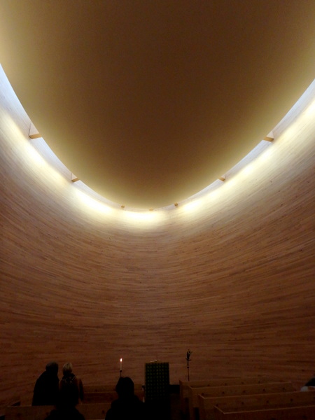 船のような形をした、木のぬくもりが感じられる礼拝堂です。