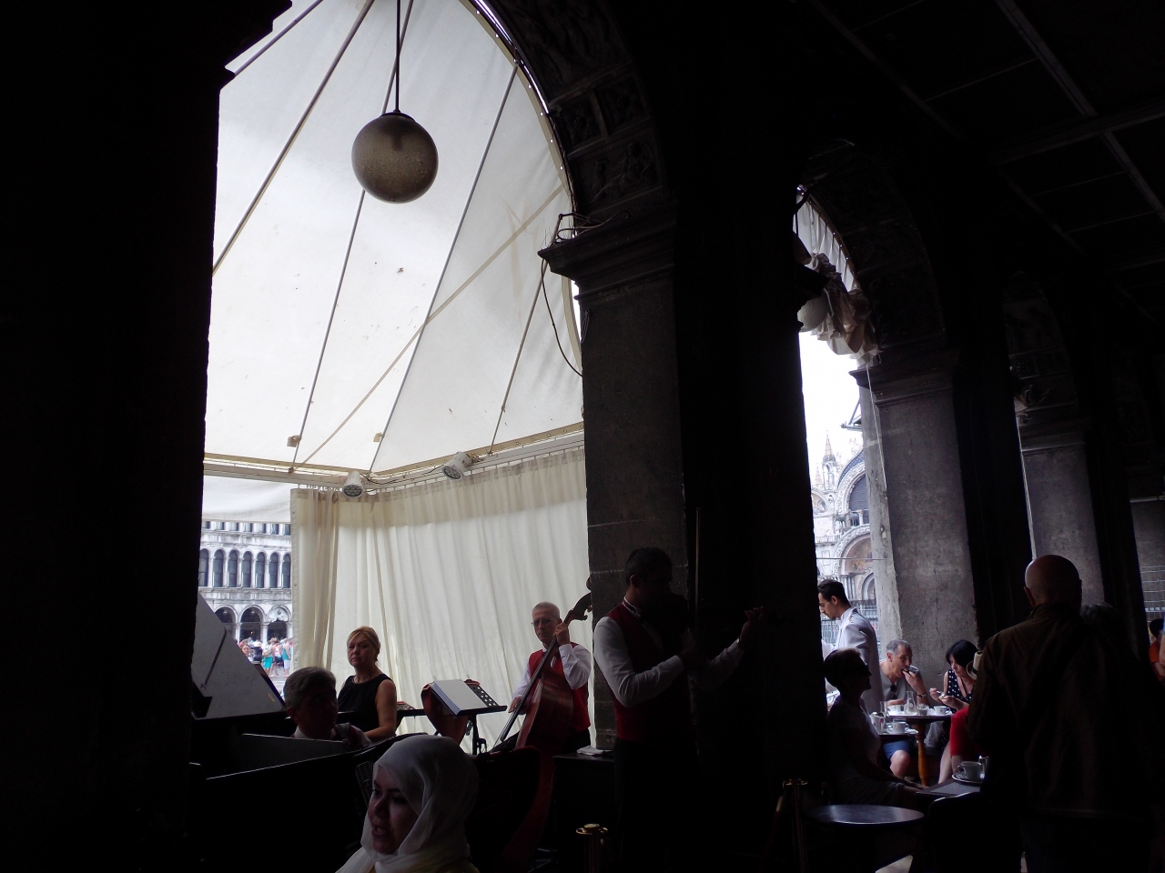 ベネチア最古のカフェ。回廊で生演奏も。