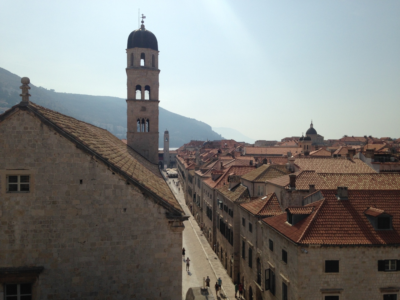 ピレ門を通って旧市街に入ると、まっすぐ伸びるプラツァ通りの先にある、まっすぐ高い鐘のある塔です。旧市街では特に高いので、通りからも城壁を歩いている時も良く見えて目立ちます。夜はライトアップされてなおさら綺麗です。