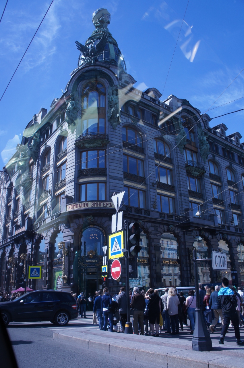 ネフスキー大通りにある見るべき歴史的建造物の一つ。ちょうど角地なのでパッと目を引きます。外壁の上部は彫像で装飾され曲線と直線が入り混じった屋根のラインも遊び心を感じさせます。角の屋根の上には双頭の鷲と地球儀もユニークです。今は人気書店になっているそうです。