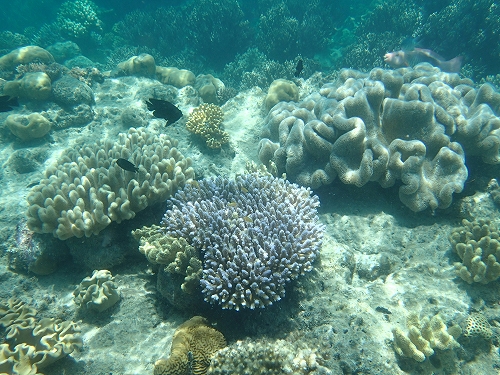 ビーチから見る海の風景は絶景。海の中もサンゴがいっぱい。ウミガメと一緒に泳げて大満足!夫は沖の方でマンタにも会っていました!