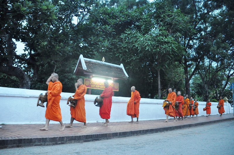 托鉢があるメーンストリート、サッカリン通りに面している。朝、まだ暗いうち、この寺の前で待っていると、5時半ごろ、お坊さんたちの一団が必ず歩いてくる。ルアンパバーンで托鉢の様子をカメラに収めたい場合、ここはねらい目だ。ストロボで光らせるのを避けるため、カメラの感度をあげておくなどの準備を忘れずに。