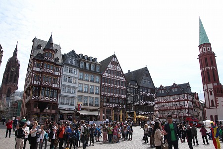 噴水のまわりに旧市庁舎をはじめとするドイツらしいかわいらしい形の建物が並んでいます。フランクフルトはここしか観光スポットがないとよく言われますが、たしかにここは1階ににカフェやみやげもの屋が入っている建物が多くたくさんの観光客で賑わっていました。