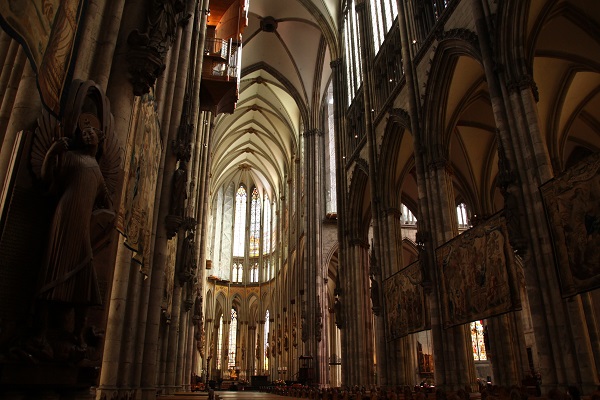DBのケルン駅を出てすぐ目の前にありますが、大きすぎて駅前からだと全景を写真に収められないほど。さすがの迫力です。600年以上の歳月をかけただけあって、広さもすごいですが、外観も内部も細かいつくり。ステンドグラスもバイエルン窓に代表される伝統的な宗教モチーフのものから斬新な幾何学模様のものまであり、色づかいも鮮やかです。途中で礼拝が始まるということで観光客は追い出され、後で戻ってきてまた入りました。