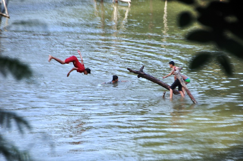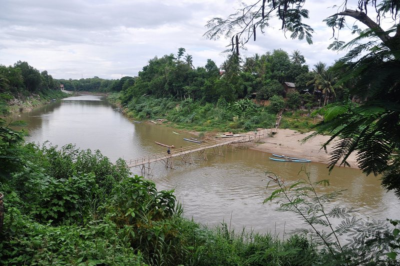 ルアンパバーンを流れるメコン川の支流。川沿いの道路にある階段を下りていくと、竹で組み立てた橋がかかっていたり、その竹橋のそばで川遊びをしている子どもたちがいたり。本流のメコン川とは一味違った趣を見せる川だった。中州もあり、そこを散歩する女性もいた。どれも撮影の好対象だった。