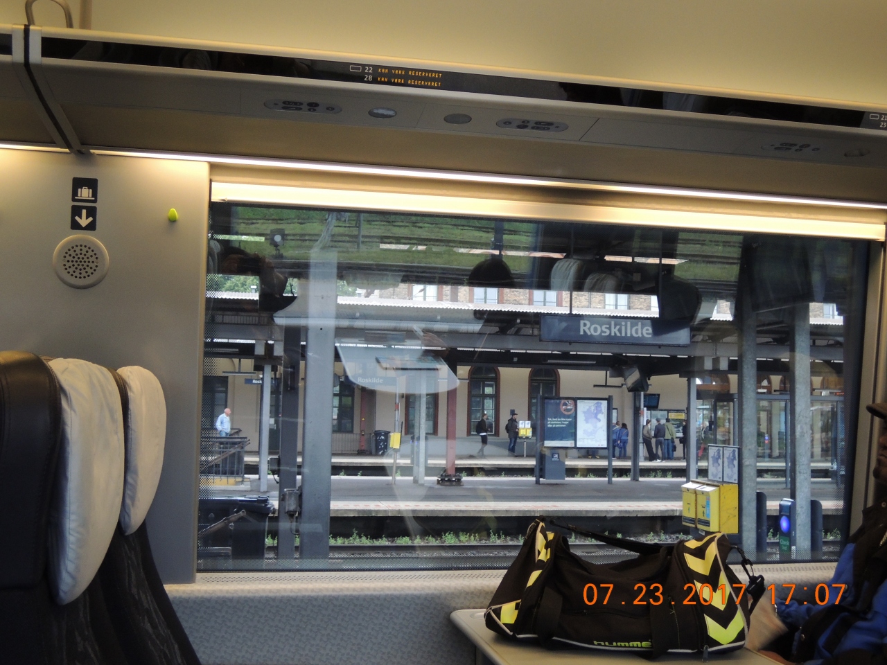 乗車している若い女の子に尋ねたら、wrong way と言われました。この駅で降りるより次の次で乗り換えた方が駅が大きいからいいと教えてもらい、さらに乗り換え駅でもう一度若い女の子に確認すると携帯で検索してくれてコペンハーゲン中央駅に戻ったら何番線の何時の電車に乗ったらいいか調べてくれました。皆さんとても親切でした。切符には有効時間が記載されていて、乗務員がチェックに来たら間違って違う方向の電車に乗ってしまったと言えば大丈夫よ。とアドバイスしてくれた人もいました。
