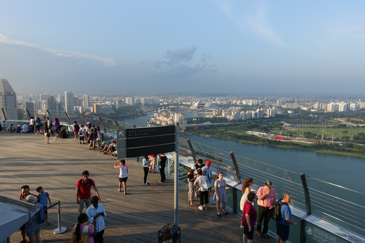 マリーナベイサンズの屋上の一画が、スカイパークという展望スペースになっています。1階でチケットを買って専用エレベータで一気に屋上へ。マリーナベイ側も、ガーデンズバイザベイ側も、両方見下ろすことができます。ウッドデッキのフロアに座ってのんびり景色を楽しんでいる人でにぎわっていました。