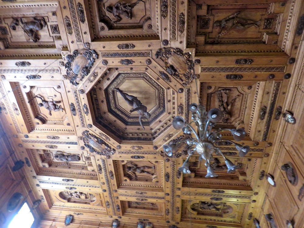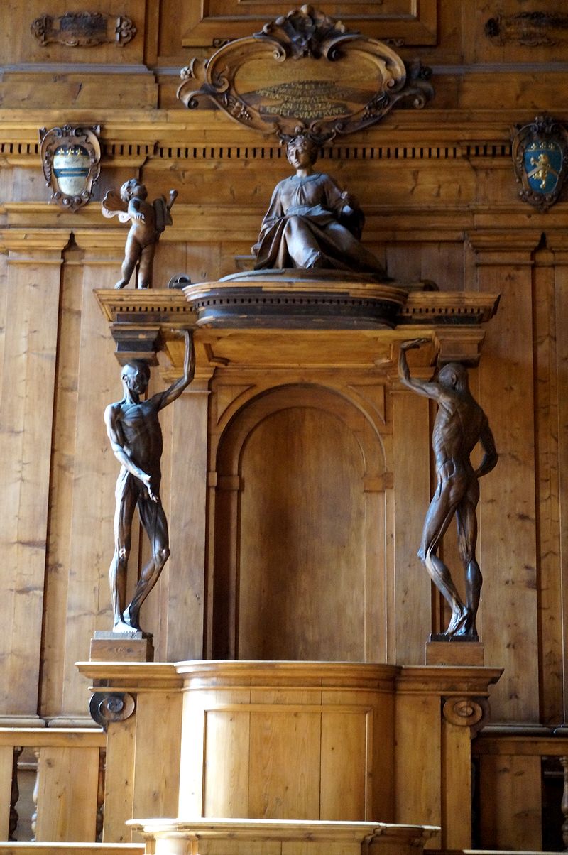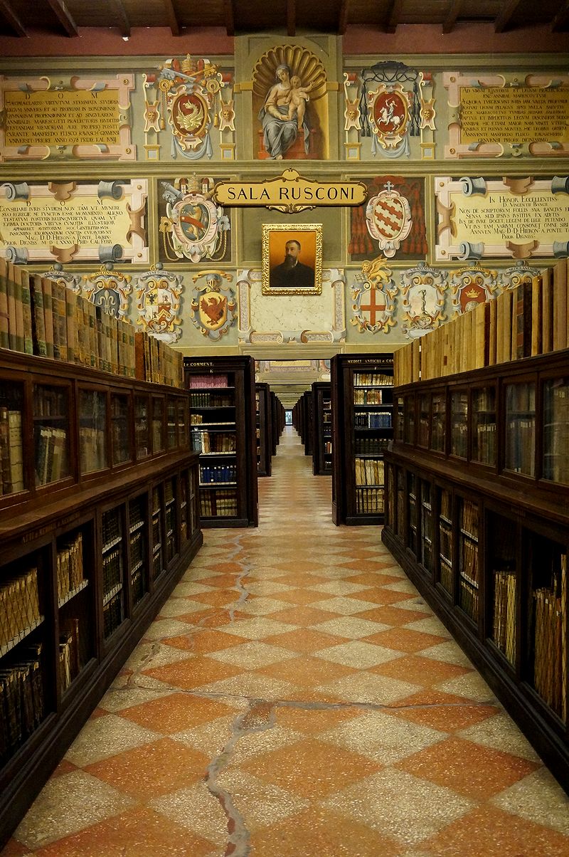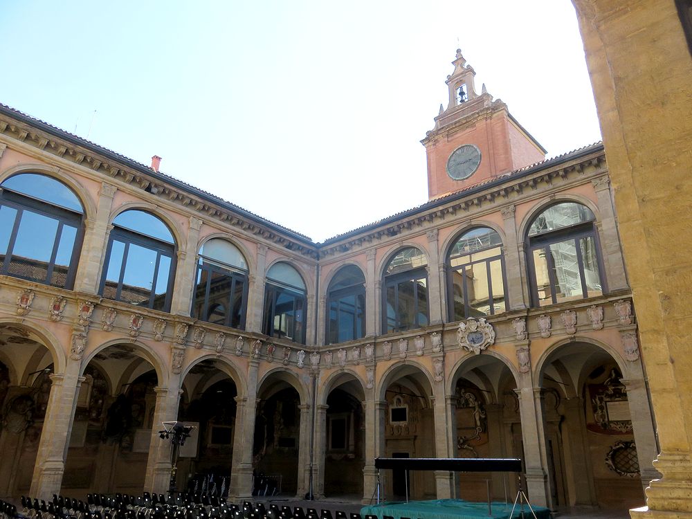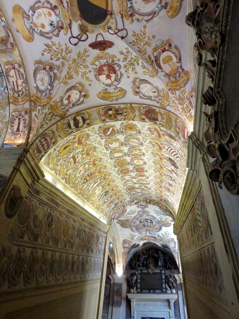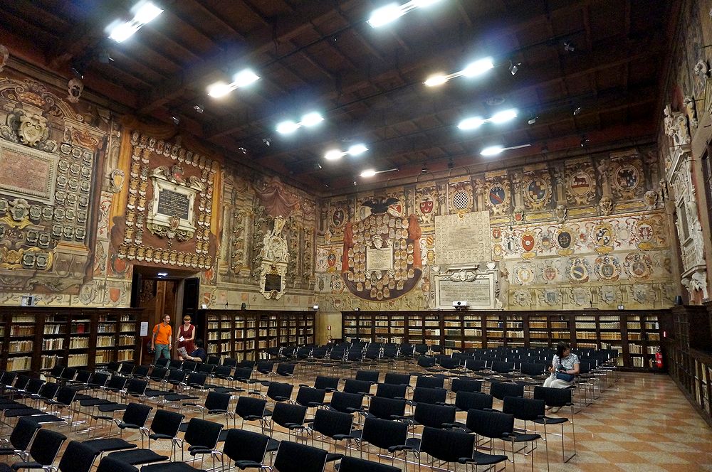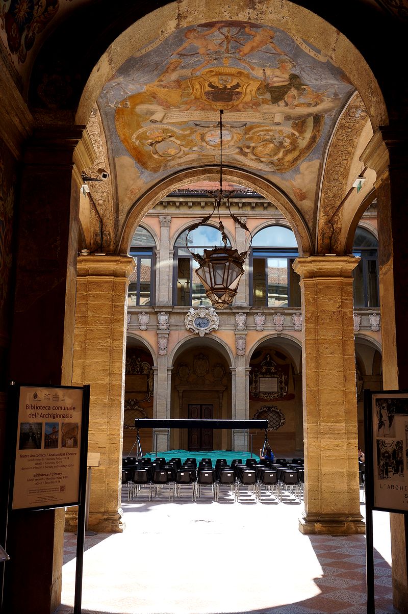 無駄に歩いてしまいました。実際はマジョーレ広場の西南の端、サン・ペトロニオ大聖堂裏手のアーケード街の途中に、BIBLIOTECA DELL’ARCHIGINNASIO(アルキジンナージオ宮殿の図書館)と書かれた赤い幕が頭上に掲げられたところに入口がありました。旧ポロ―ニャ大学が現在ではアルキジンナージオ宮殿&図書館になっていることがわからないと迷ってしまいます。ボロ―ニャ大学は、1088年創立のヨーロッパ最古の大学で、ここは旧ボロ―ニャ大学跡地に1562年から1563年にアルキジンナージオ宮殿が建設されたという。入り口をはいると中庭があり、その一画には別の入り口があり、壁や天井には紋章や絵が隙間なく飾られていて、大学とは程遠い内装に驚かされます。2階に上がる階段の壁や天井も同じように紋章だらけです。2階には市立図書館と旧ボロ―ニャ大学解剖学教室があります。解剖学教室は有料で10時から見学できますが、観光客は市立図書館には入れません。ただし、少し離れた2階廊下奥のホールのみ、入り口にいる係員に解剖学教室のチケットを提示して見学することができるので、チケットはなくさないように持っていてください。解剖学教室内部は天井や壁床ともに木製で、解剖台だけが大理石でできています。私達は木製の大階段の学生席に腰を掛け、教壇横の皮をはがされた2人の像や壁の立像や天井の星座の木彫りなどをながめ、当時の医学生の気分にひたることができました。想像以上にすばらしかったので、ボロ―ニャに行く機会があったら、ぜひ訪れて見てください。