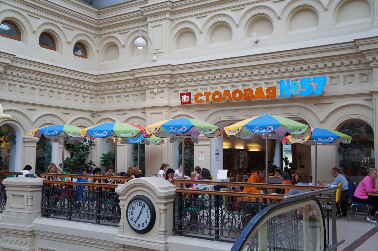 到着日の晩、赤の広場観光の帰りに立ち寄りました。グム百貨店3階端にあります。中はカフェテリア形式、各自トレイにショーウインドウの中から好きな小皿や飲み物を取ったり、好きなお惣菜を入れてもらったり…最後に会計を済ませます。ロシア語も英語も一切話さず利用することも可能(^^;)お料理の味や店内の雰囲気は今一つですが、とにかく安くとても気軽に利用できるレストランだと思います。