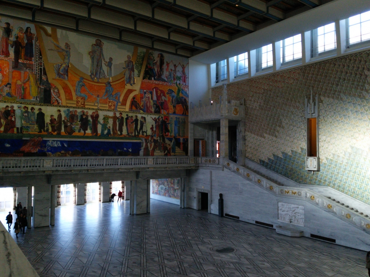 ノーベル平和賞の授賞式となっている市庁舎です。大きな油絵があったり2階のムンクの間も見どころたっぷりでこれが無料とは信じられません。私が行ったときは途中から団体さんがはいってこられましたがそれまでは3人ぐらいしか観光客はおらずゆっくり見ることができました。