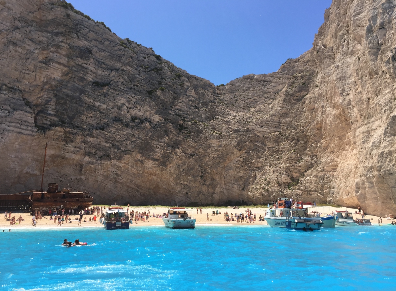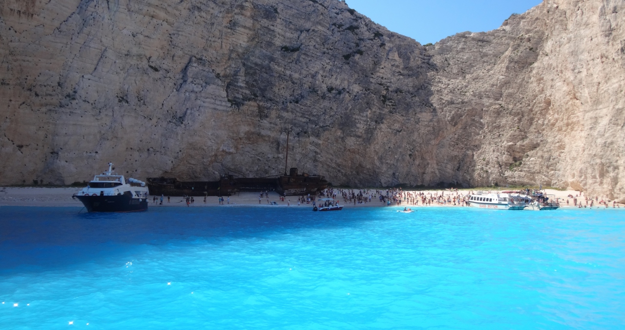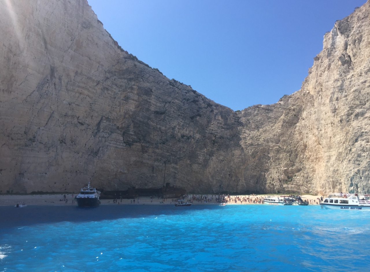受付のある島北端のスキナリ岬にレンタカーで9時過ぎに到着。パンフレットによるとボートは10分おきに出ているらしいんですが、その時のお客は私たちだけで、貸切状態で9時半ころまずBlue Cavesに出発。それから一旦岬の船乗り場に戻り、少し大きな船に乗り換えて他のお客さんたちとShipwreck Beachに11時に到着。1時間後に迎えに来てくれるまで自由行動。と言っても、ビーチには打ち上げられた難破船以外なにもないのでただのんびりするだけですが。