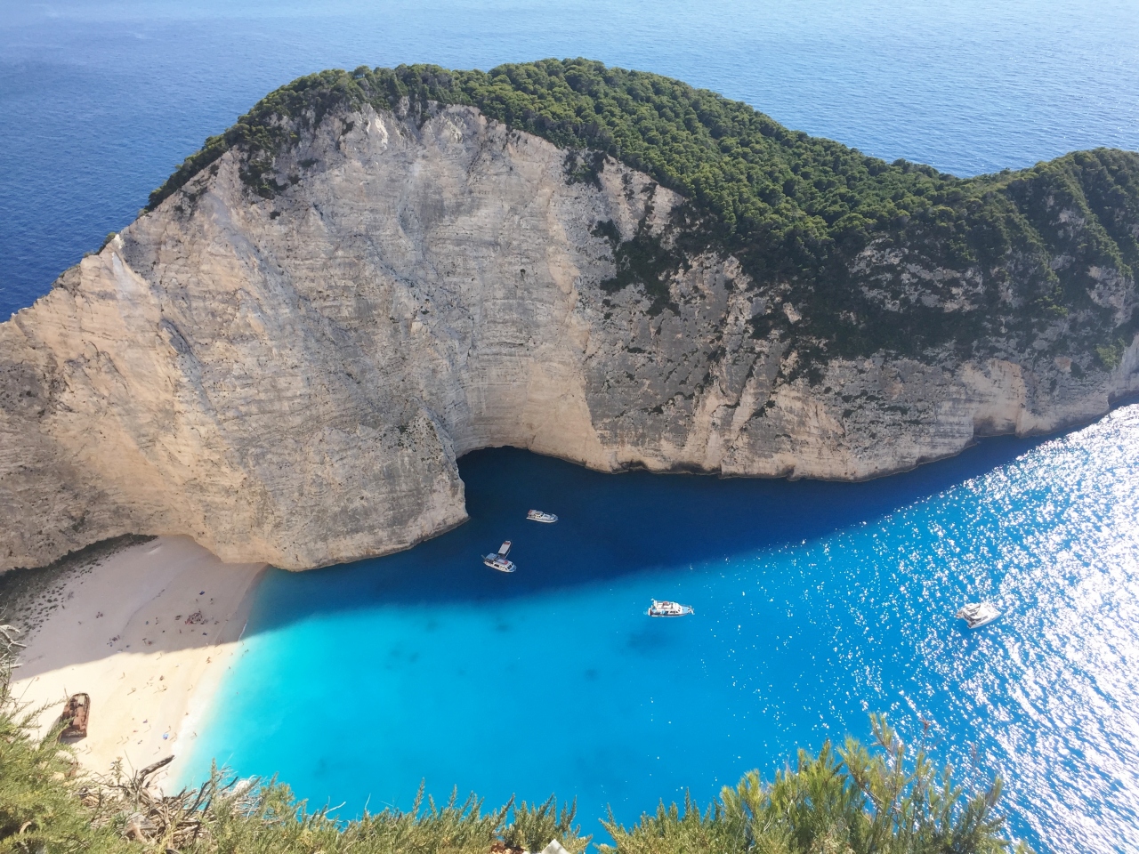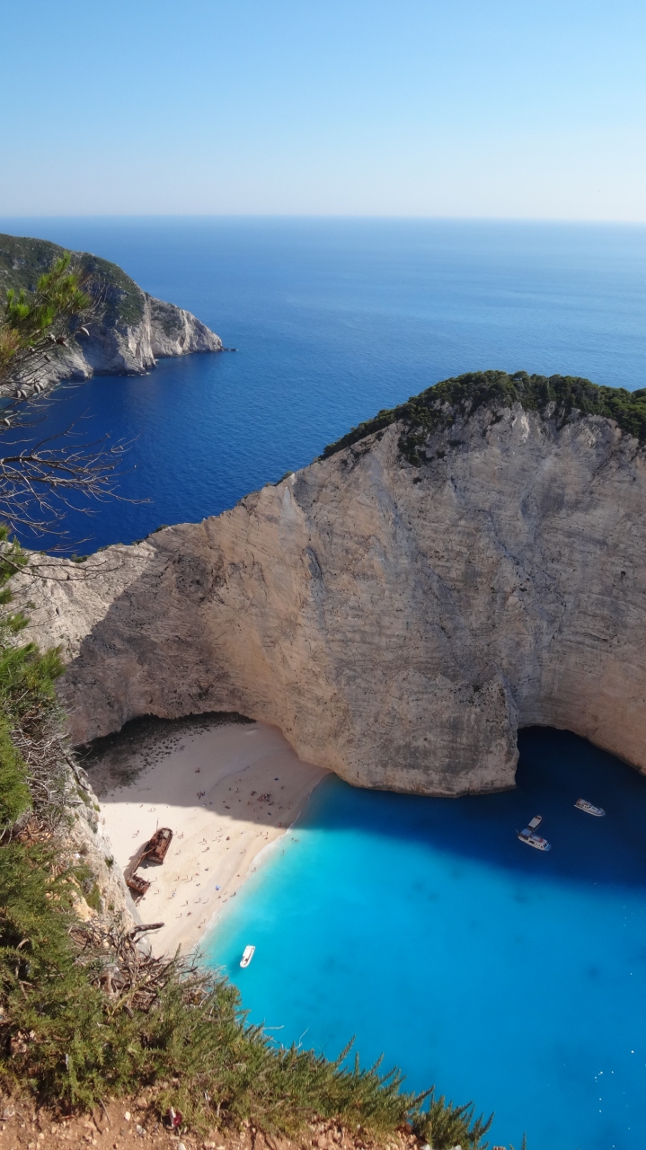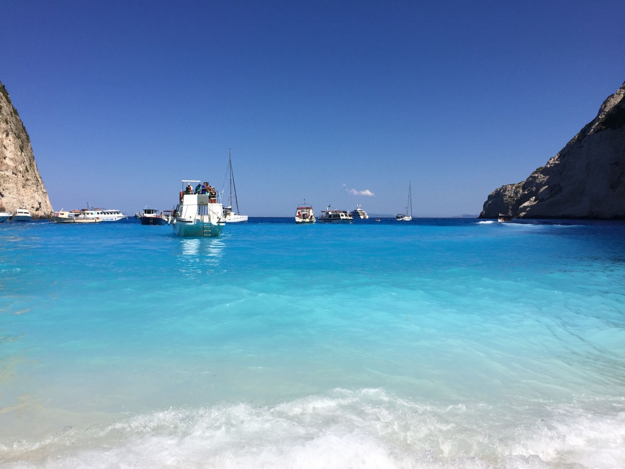 受付のある島北端のスキナリ岬にレンタカーで9時過ぎに到着。パンフレットによるとボートは10分おきに出ているらしいんですが、その時のお客は私たちだけで、貸切状態で9時半ころまずBlue Cavesに出発。それから一旦岬の船乗り場に戻り、少し大きな船に乗り換えて他のお客さんたちとShipwreck Beachに11時に到着。1時間後に迎えに来てくれるまで自由行動。と言っても、ビーチには打ち上げられた難破船以外なにもないのでただのんびりするだけですが。