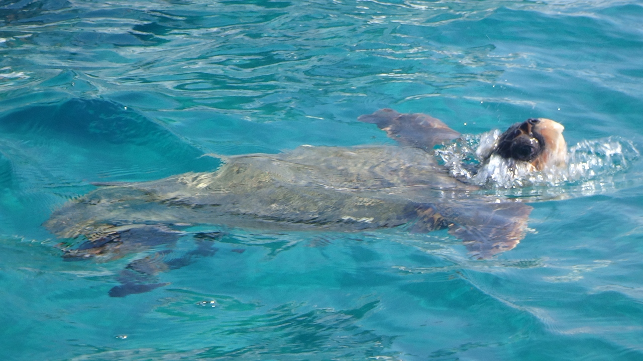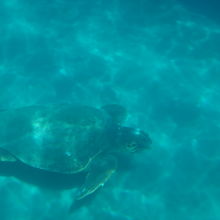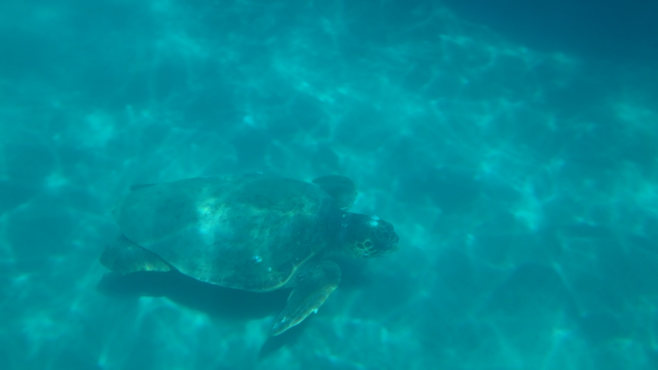 まずLaganas Beach前で海亀watchingをするんですが、「亀はシュノーケルなどで見たことあるしなぁ」と思っていたんですがけっこう楽しめました。常に亀を追っているので飽きることがありませんでした。他にもツアー船が来ていて、海亀が頭を出した時には歓声と拍手が起こります。大きな船でのツアーもあったようですが、船が大きいので海亀の近くに寄れず、遠目に見ているだけだったのが残念そうでした。