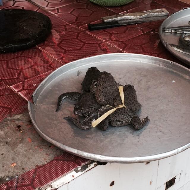 涼し朝のうちにとベンタイン市場にきました。朝6時前ですが既に市場には品物がびっしり並んでいあます。塩焼きにしてよさそうな魚やハゼ、エビ、イカなどカエル以外はどれも美味そうですが、どこも保冷設備が整っていないので刺身で食べるのは遠慮したほうが良さそうですね。この後、周囲の基本はどんどんあがってくるので早朝の内にかわないと直ぐに腐っちゃいそうです。