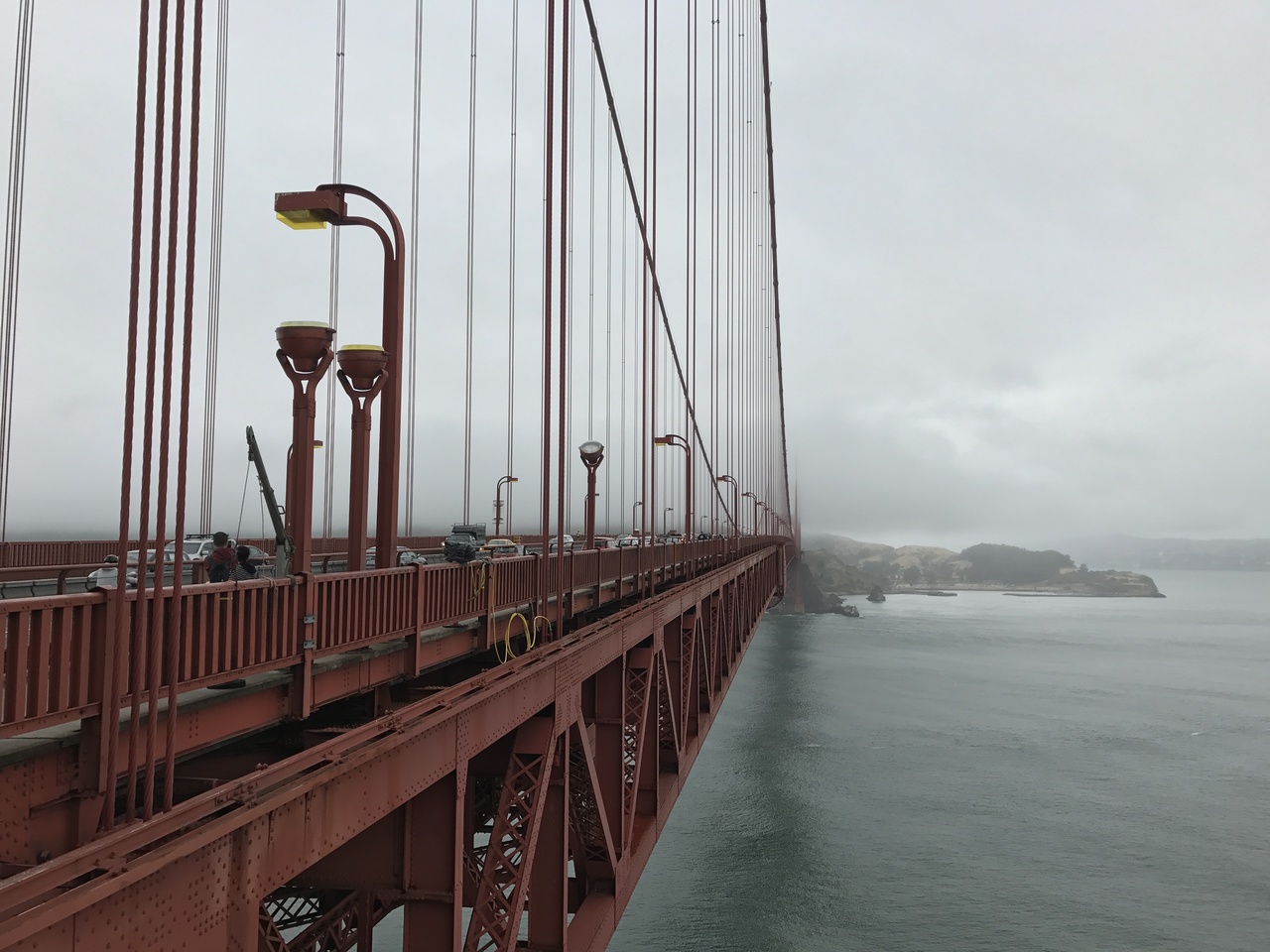 年に1〜2回ほど訪れますが、今回は小雨で霧の中のゴールデンブリッジを見ることができました。思わず、スマホでパシャリ。フィッシュマンズワーフから路線バスばすですが、普通muniバスのことろ、違うバスに乗ってしまったので、5$取られました。 muniバスなら2.5$で往復(時間制ですが・・・)いけちゃいます(残念!)。霧[小雨]の中のゴールデンゲートは感動的でした。