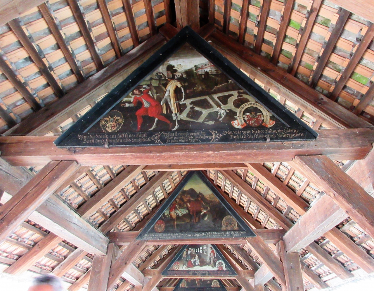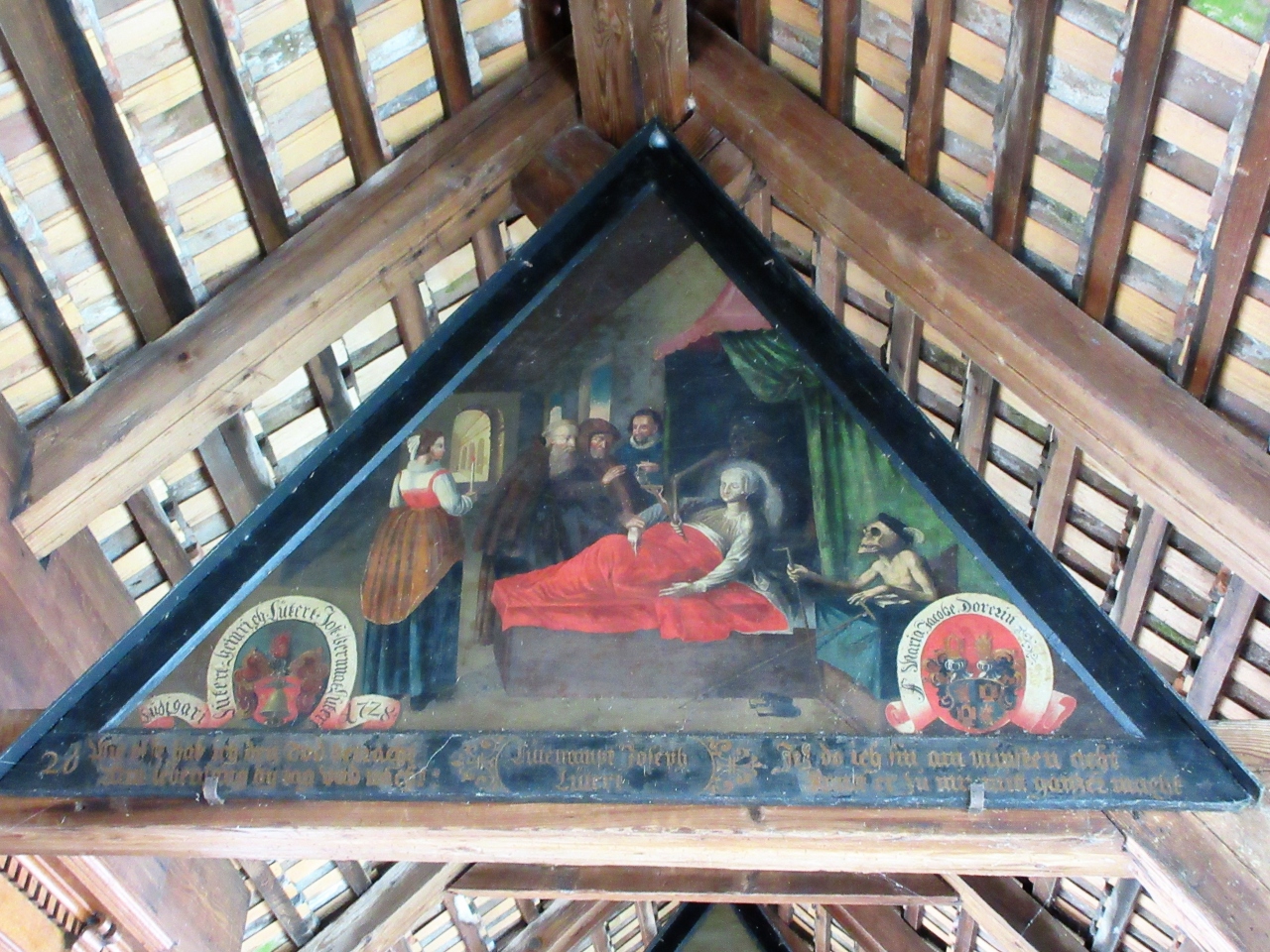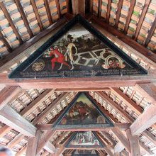 天井の梁には17世紀に描かれた「死の舞踏」と呼ばれる67枚の絵がかけてあります。
