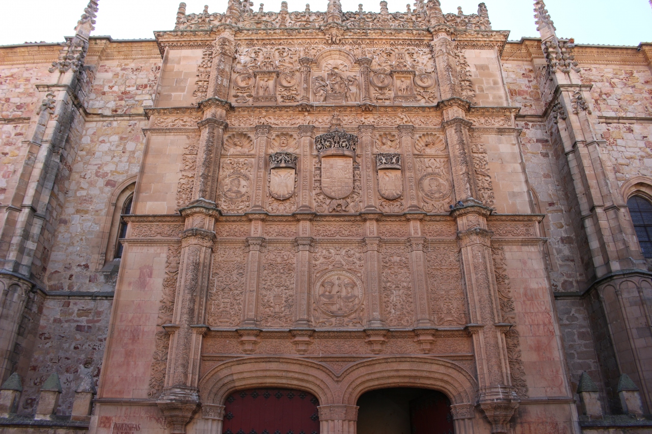 スペイン最古でヨーロッパで3番目に古いと言われるサラマンカ大学ですが、旧市街の一角にあり、敷地などはそれほど広くなく、1つの建物といった感じです。近づくと学生らしい人や教授っぽい人を見かけるようになります。入場料が必要だったこともあり、外観だけ見学しましたが、入口は、歴史と威厳を感じさせるものでした。