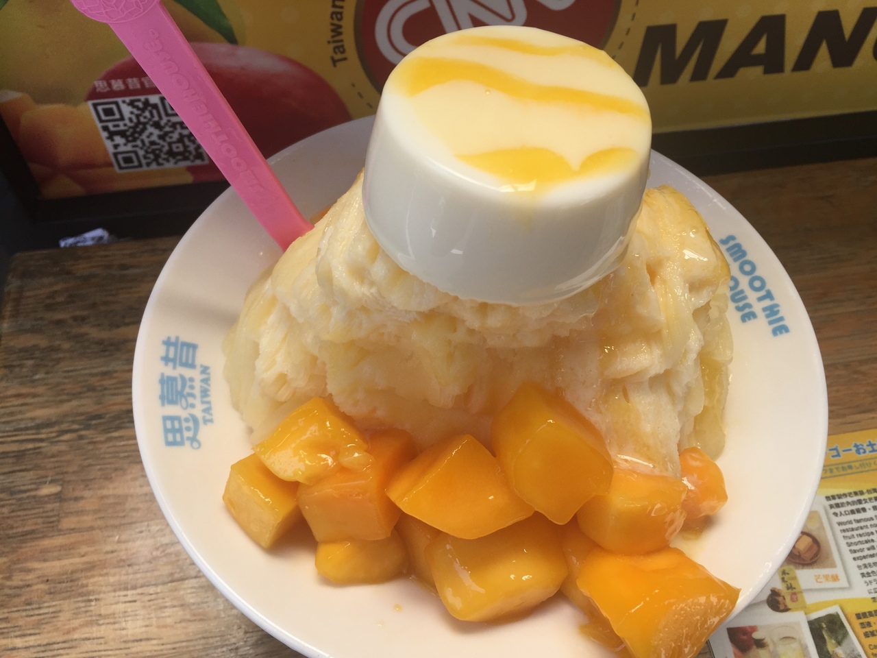 東門駅から地上に出るとき、壁一面に広告があって、CNNでも紹介され、海外にも出店していると書いてありました。名物のパンナコッタがトッピングされたマンゴーカキ氷をオーダーしました。210元と高いのが難点ですが、マンゴーが甘くて美味しかったです。