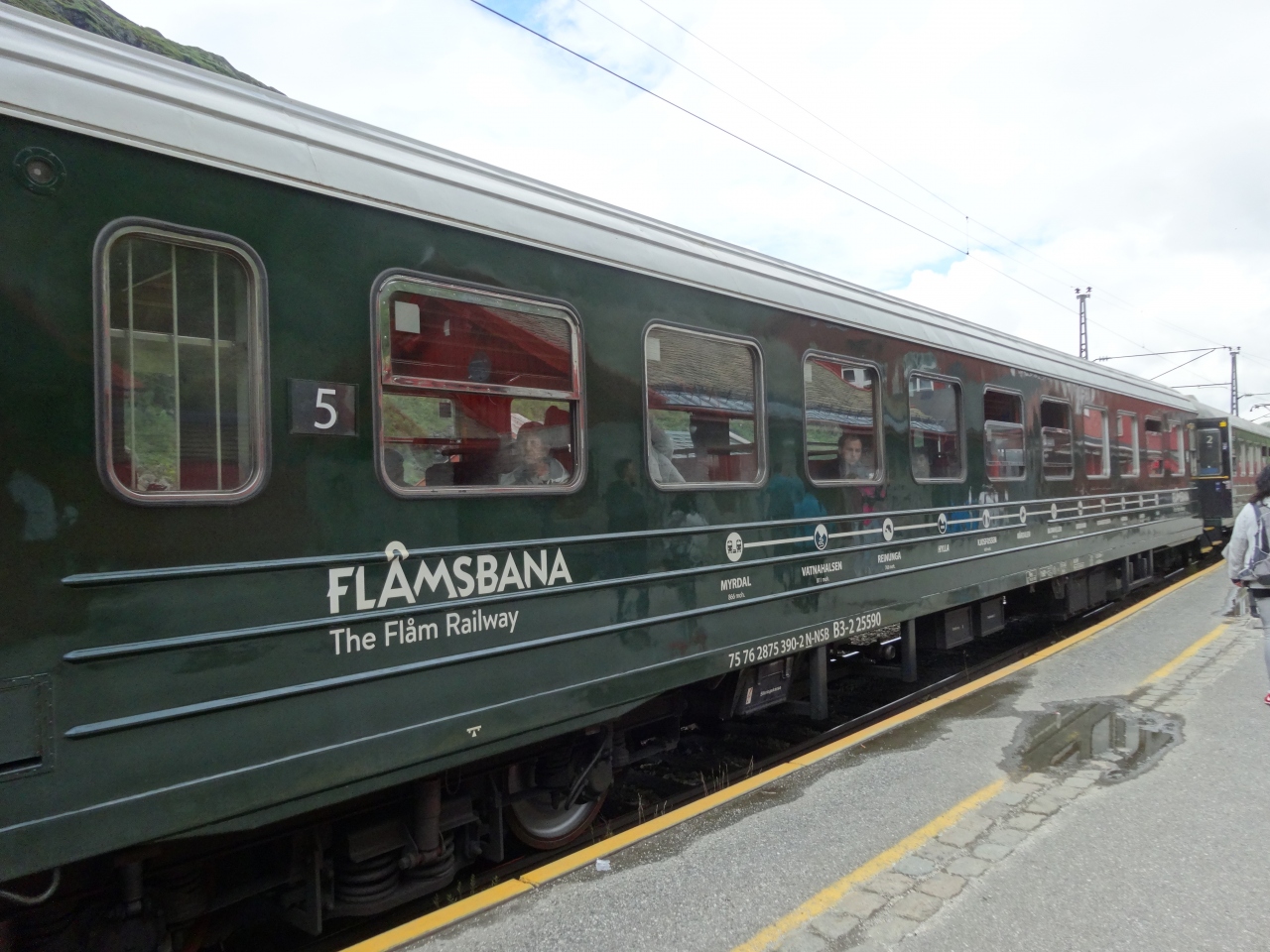 ミュールダールからソグネフィヨルドの観光拠点となるフロムまでをつなぐ観光列車です。切符はノルウェー国鉄の駅の券売機で3日前頃に買いました。車体の深い緑と内装のクラシックな赤の対比が雰囲気あります。窓からはフィヨルドの山や滝を見れて楽しめました。