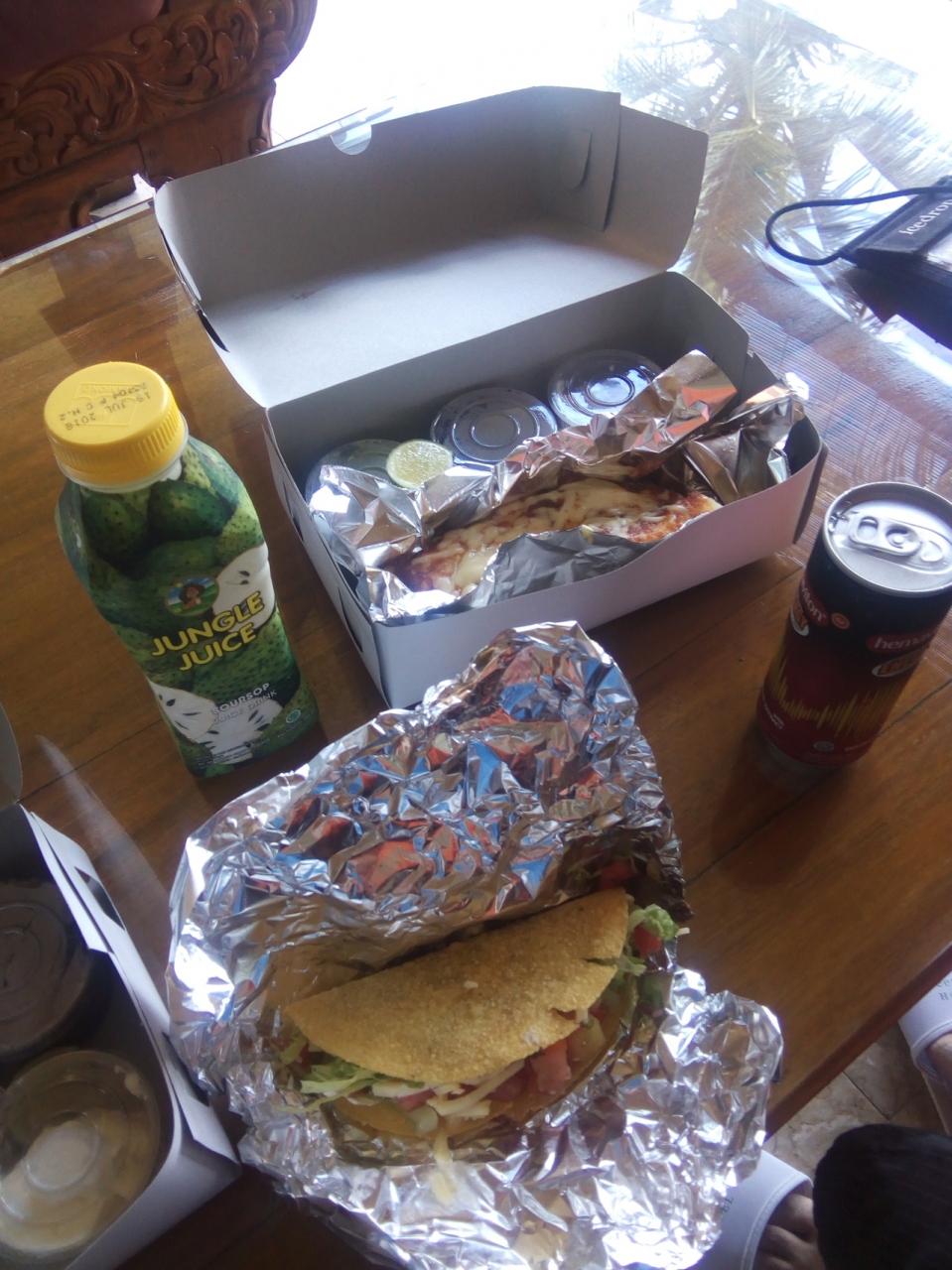 タコスと、ラザニア?のようなラップされたものを注文しました。共にボリューム有り!ボックスに入れてくれ、持ち運びも便利。