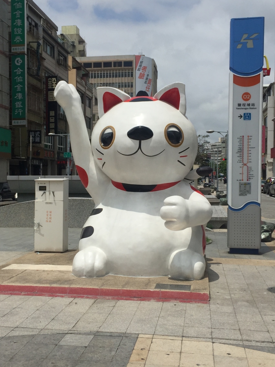 旗津半島に行った後、ワンタン麺、小籠包、マンゴーカキ氷を食べに行くために利用しました。駅を降りて地上に出ると、台湾風の大きな招き猫がありました。ホームに行く階段には、水の中で泳ぐ魚の絵がペイントされていました。