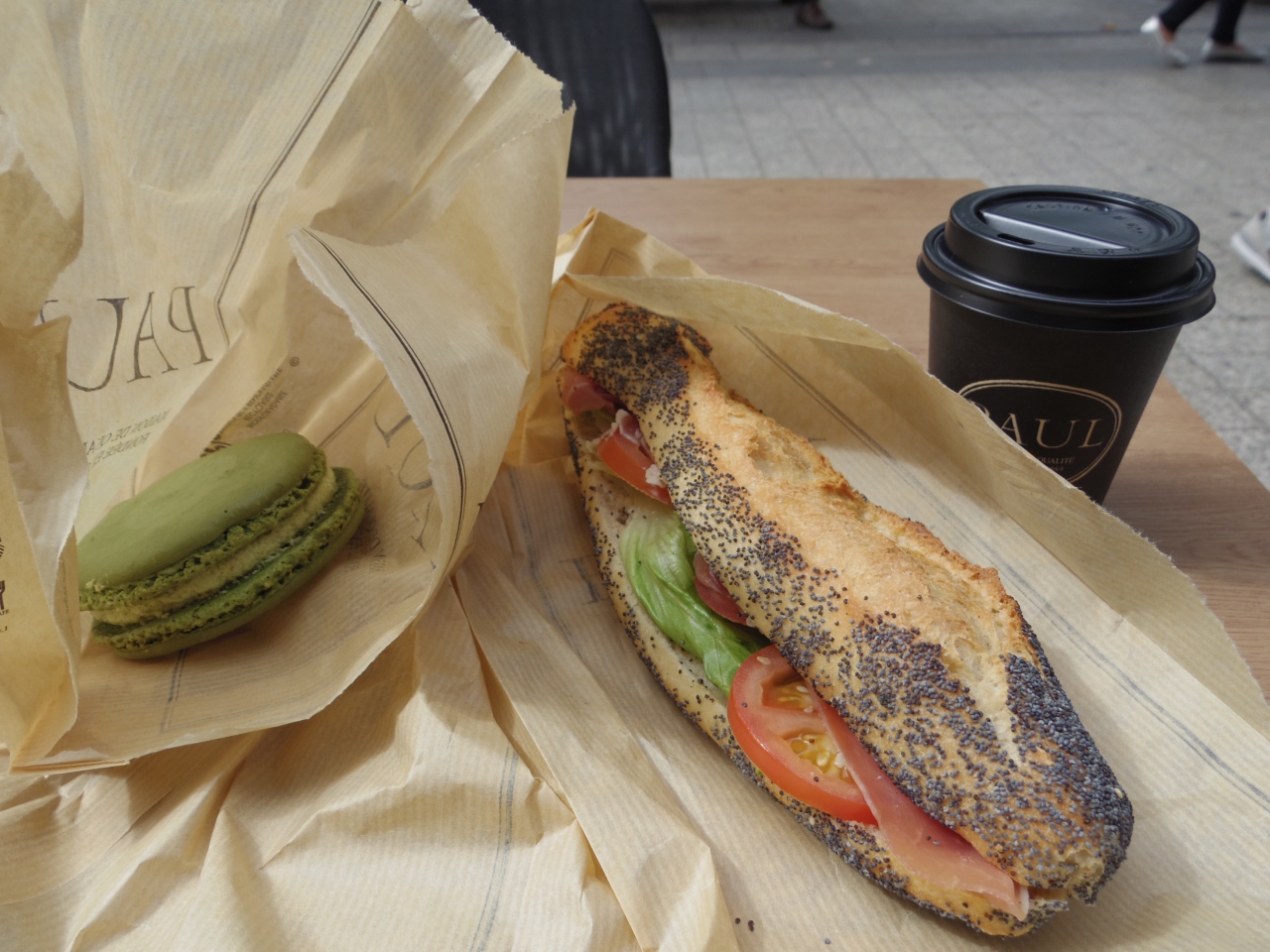 羽田空港第2ターミナルから飛行機に乗る前は、よくPAULのフランスパンのサンド(生ハム)を買っているので、シャンゼリゼを歩いていた時に見つけて嬉しかった! 翌朝、10時半頃行くと5,6人並んでいましたが、手際が良くて待たされませんでした。フランスパンのサンドイッチとマカロンとコーヒーを買いましたが、安くはありません。それにフランスパン・サンドは羽田店の方が美味しかったし、大きなマカロンは持て余して残しました。