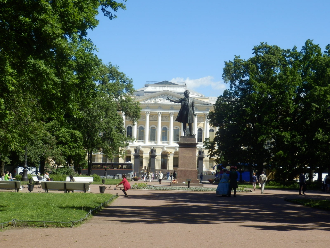 ロシア美術館の前にある広場です。広場の中央は開けていて、プーシキン像が建ち、その背後にロシア美術館の建物が見えるようになっていました。緑豊かな公園で、ベンチでは観光客が休憩していました。観光客に写真を撮らせる美しいドレス姿の人も見えました。