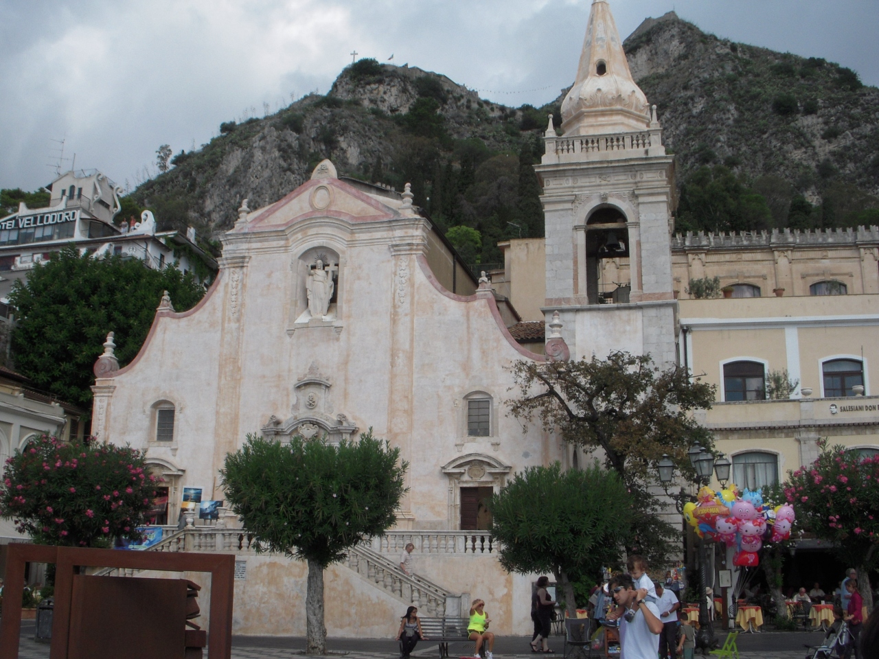 4月9日広場は、タオルミーナの町のメインストリート「ウンベルト1世通り」沿いにあり、広場に面して建っているサンタゴスティーノ教会は、町を奇跡的にペストから救ってくれた聖セバスティアーノに捧げて1448年に建てられたゴシック様式の教会で、後にアゴスティーノ派の神父がタオルミーナにやってきて教会を拡張し、修道院にしたために、聖アゴスティーノ教会と呼ばれるようになったそうです。