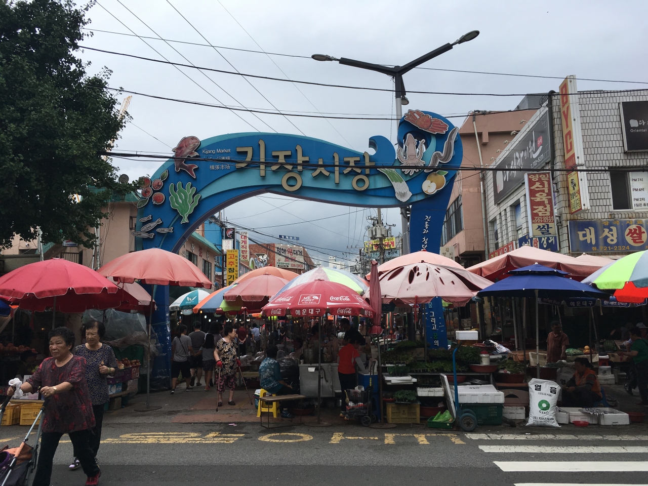 機張のた 有名な蒸しカニを食べに 釜田から 電車で やってきました。駅を降りて 市場の門をくぐり カニ店に着くまでに 通った 機張市場。 野菜あり、魚あり、干し物あり 洋服ありと なんでもそろっているようで、多くのヒトで賑わってました。(2017.8プサン3)