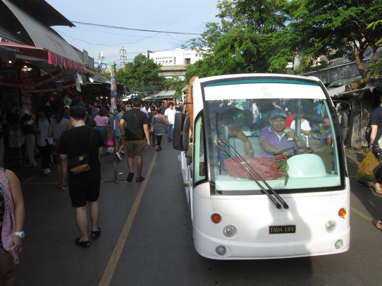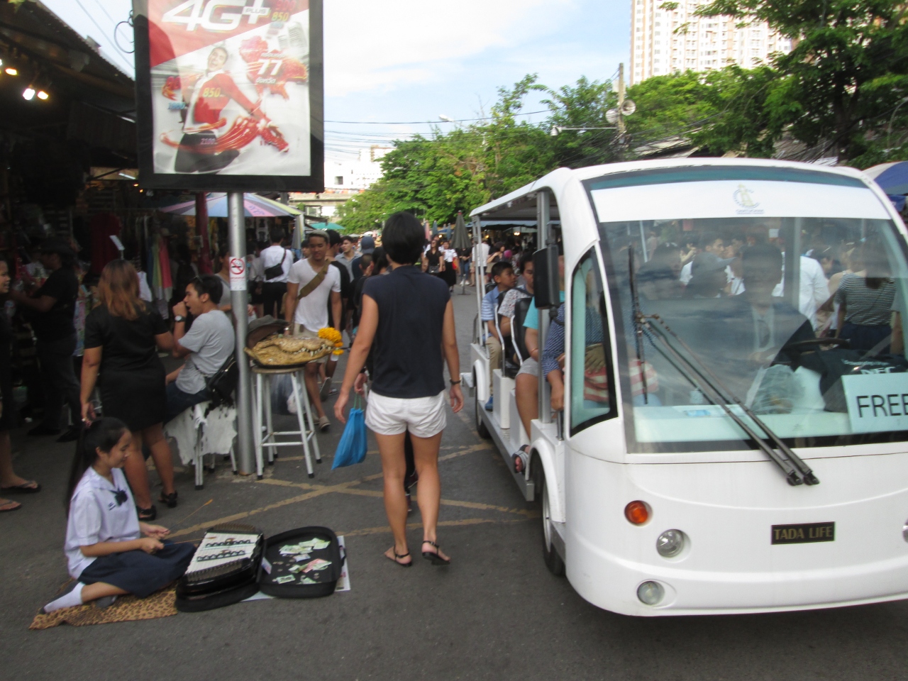 7月の滞在中にチャトゥチャックウィークエンドマーケットに訪問すると、敷地内に大きいカートを発見しました。マーケットのメインロードを通り過ぎていました。空港で良く見かけるカートサービスを導入したようです。無料で利用できるようで、ほぼ満席でした。