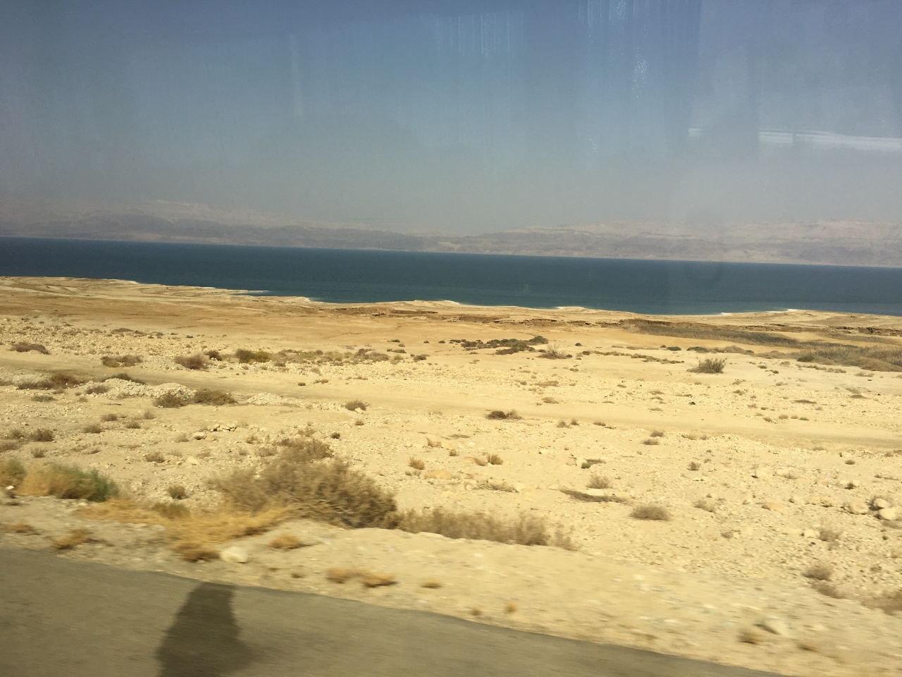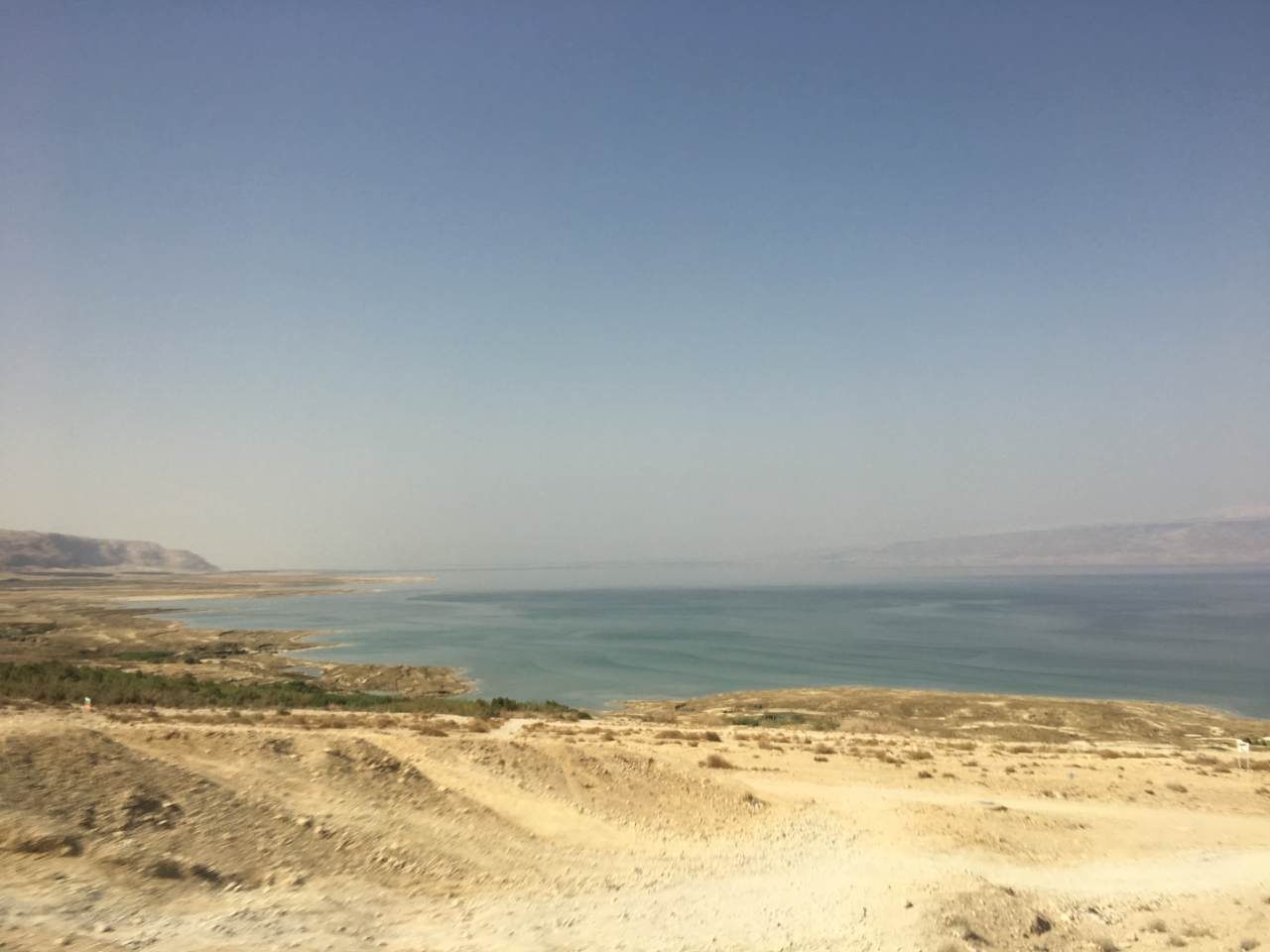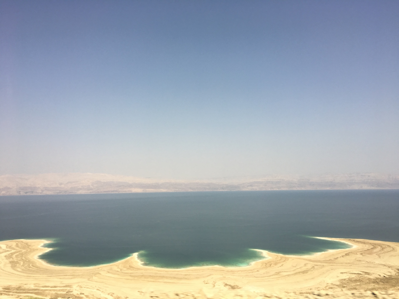 某ホテルの更衣室で水着に着替えて、いざ死海浮遊体験へ。ビーチにはバスタオルとペットボトルのみ持参し、腕時計・携帯などは絶対持っていかないでください。濃い塩分で故障します。ビーチと言っても、実際は塩浜です。白い塩の結晶が波打ち際にびっしり積もっています。水深50センチくらいのところで仰向けになります。