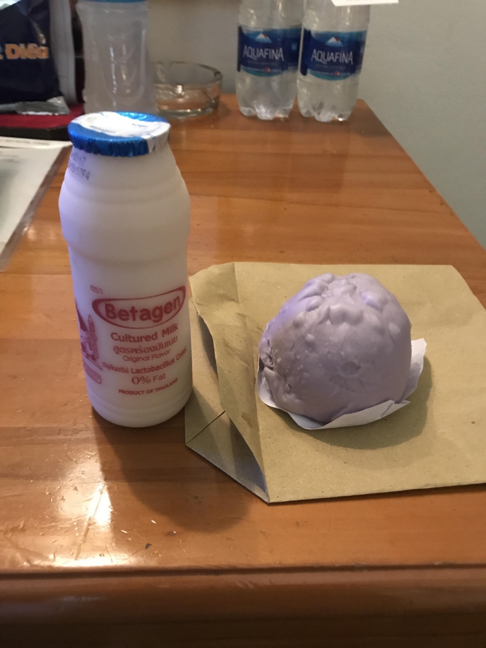 小腹が空いたので、ヤク◯トっぽいものとタロイモ(?)のまんじゅう(コンビニによくある蒸し器に入っていた)をお買い上げ。