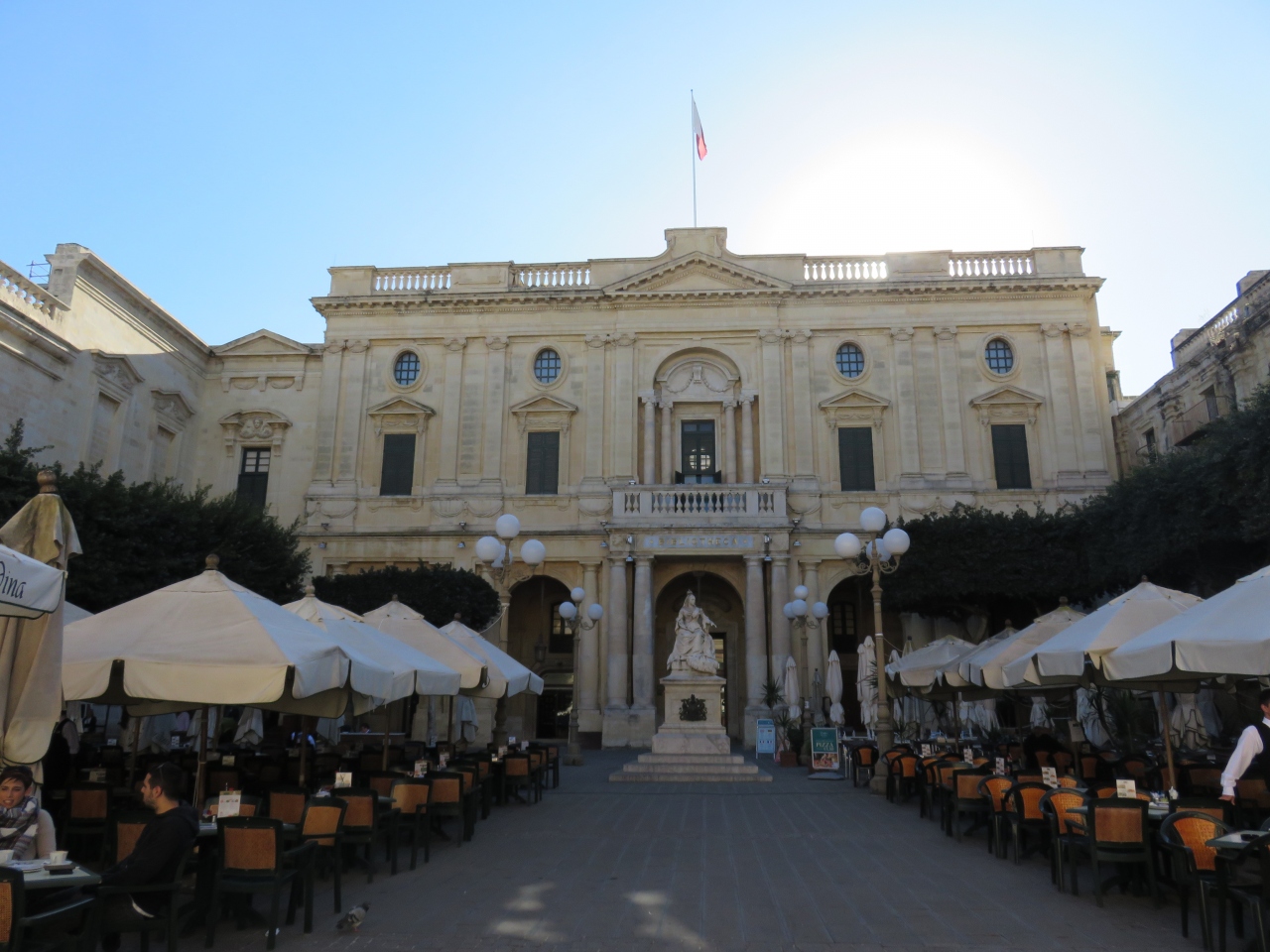 この広場に面して1837年創業の老舗カフェがあり、なんといっても天井にフレスコ画をもつこの雰囲気がいいのですが、このカフェのテラスというには広すぎる広場一面のテラス席は多くの人でにぎわっていました。現地の人にとっても重要な憩いの場のようで、木曜夜8時からはジャズの演奏も楽しめるそうです。ヨーロッパでよく見かけるのは、公共の場もテラスにしてしまう事に戸惑いを感じました。