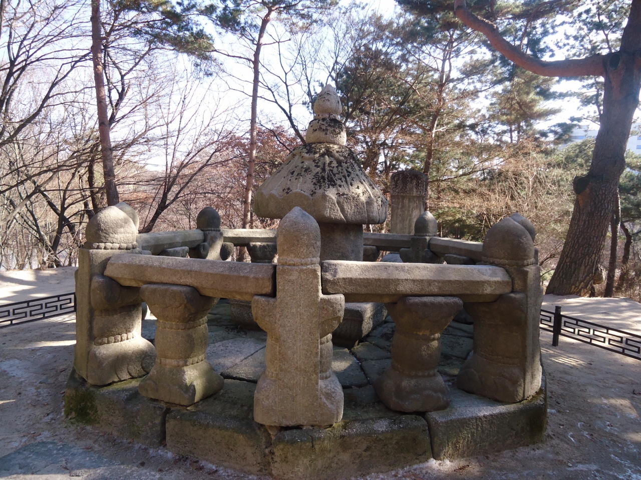 成宗王が生まれたときのへその緒や胎盤をとてもきれいに何度も洗い壺にいれて国が繁栄するように風水で運気のよいところに保管していたとのことです。最初は王宮内ではなくて別のところでしたが後日こちらに移されたということでこのような石碑がありました。ちょっとおもしろい風習だなと思いました。