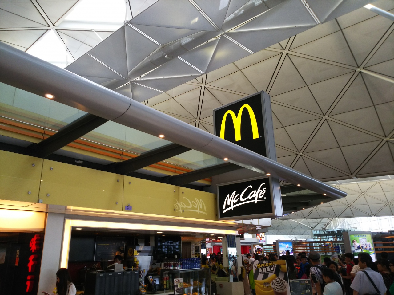 香港国際空港の出発ロビー(制限エリア)にあるマクドナルドです。フードコート内なのでどのお店も混雑はしていましたが、マクドナルドの行列は凄かったです。ハンバーガーなどのセットメニューはもちろん、マック・カフェでは美味しいコーヒーを飲むことができるので時間に余裕があれば立ち寄ってみるのも良いです。