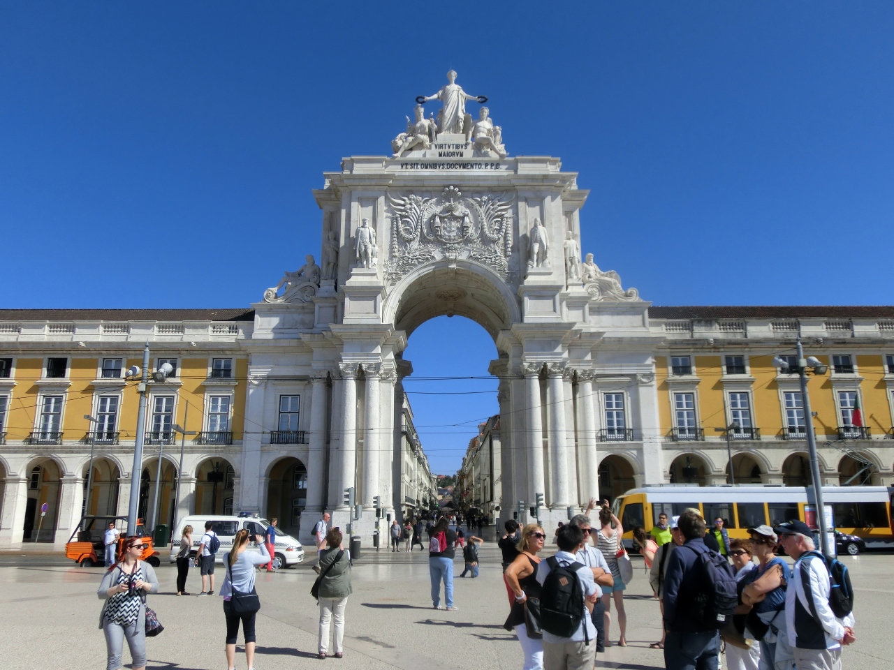 写真映えする門です。日曜などここに続く通りは人で大賑わいですが、普段はさほどでもないよう。コメルシア広場の入口を飾る門として堂々の風格です。ちなみに 勝利のアーチの頂上の像は勝利の女神だそうです。ポルトガル皇室の紋章が映えます。