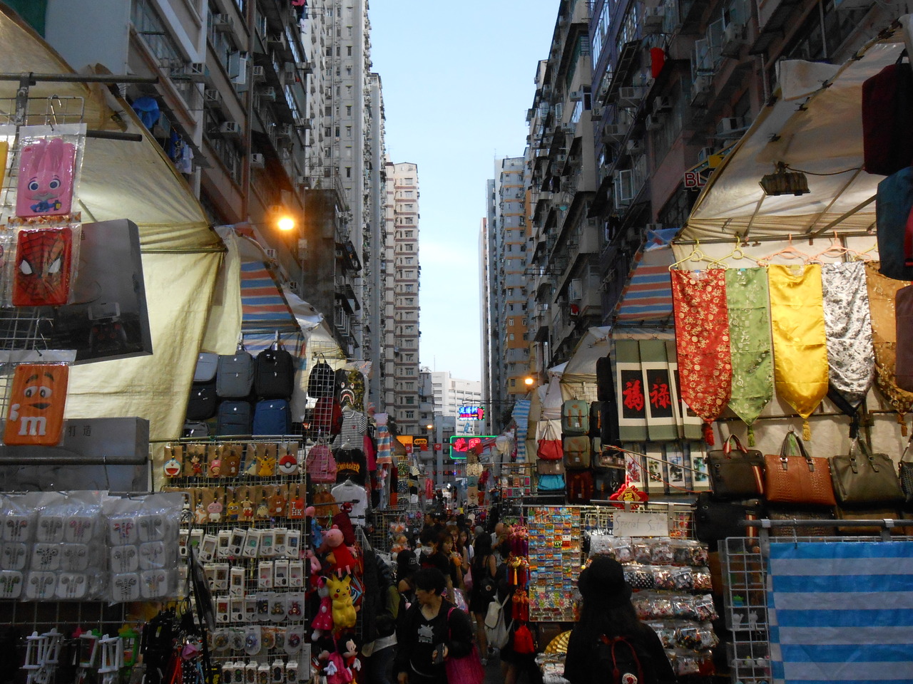 女人街は、九龍半島の繁華街のひとつである旺角エリアにあるナイトマーケットです。ネイザンロードから東に2本入ったところにある通りには両側にぎっしりと露店が並んでおり、かなり混雑しています。日用品、衣料品、雑貨など様々な物が売られていますが、交渉次第では値段は半額以下にも出来ますので、諦めずに交渉した方が良いです。
