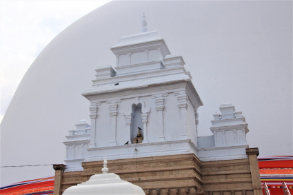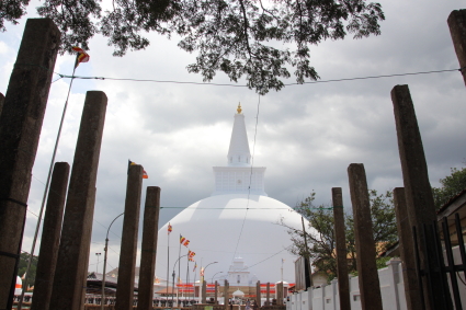 ルワンウェリ・サーヤ大塔は、紀元前2世紀に、インドからの侵略軍を撃退した、スリランカの英雄・ドゥッタガーマニー王によって建設された大塔です。現在の高さは55mですが、建設時には110mもあったといわれ、エジプトのピラミッド建設以降で、人類の造った建造物では最大と言われています。曇り空の時に訪れましたが、たまに薄日が射すと、真っ白い塔が美しく輝きます。こういう白というシンプルな色で充分に神々しさを感じますが、ほかのところの仏像はどうしてけばけばしいほどの色が塗られているのかと不思議に感じます。