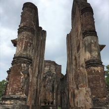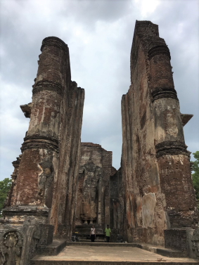 ランカティラカは、キリ・ヴィハーラの南隣にあります。13世紀にパラークラマ・バーフ3世によって建てられた寺院とのことです。高さ17.5m、幅18m、奥行きは52mという大きな建物ですが、天井が落ち、上部もかなり壊れています。往時は屋根があったはずですから、これだけ奥行きのある建物の明り取りはどの様にしていたのかなと思わせられます。1番奥には頭のなくなった仏像が立っています。